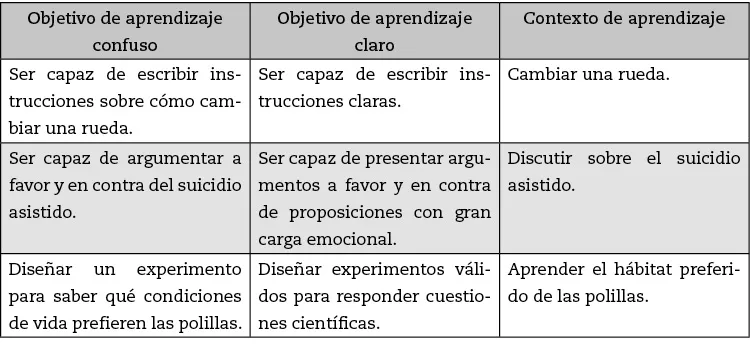A la hora de definir los objetivos de aprendizaje, un primer paso de rigor consiste en distinguirlos bien de los contextos o situaciones en los que se van a desarrollar. En esta tabla (adaptada), Dylan Wiliam (2017) ejemplifica cómo diferenciar el objetivo de aprendizaje de los contextos de aprendizaje: