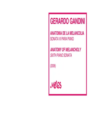 Construida en base a 23 sonidos dispuestos simétricamente alrededor de un eje central, esta quinta sonata desarrolla su forma en 23 secciones: once iniciales, una sección central, y once que reflejan a las primeras como un espejo. La obra fue compuesta para ser estrenada en el histórico edificio de la Biblioteca Nacional, dirigido en su momento por Jorge Luis Borges. Gandini entrelaza referencias borgesianas —como la mención en La biblioteca de Babel a las 23 letras que rigen el universo— con elementos cabalísticos asociados a Alban Berg. Así, los intervalos del Concierto para violín de Berg y su retrogradación se transforman en el material fundacional de esta pieza profundamente conceptual. Una experiencia musical intensa, donde la arquitectura sonora se convierte en un juego simbólico y poético.Con Anatomía de la melancolía VI, Gerardo Gandini culmina su ciclo de sonatas con una obra de gran profundidad expresiva y estructural. Esta sexta sonata retoma elementos característicos del ciclo —como la exploración tímbrica, la forma libre y las citas musicales veladas— pero los reconfigura en una pieza más expansiva y meditativa.La obra se despliega en tres movimientos contrastantes, donde conviven la densidad armónica con momentos de gran lirismo y espacio resonante. Gandini integra referencias sutiles al universo literario de Borges y guiños musicales a la tradición centroeuropea, fusionando el pensamiento musical contemporáneo con una estética poética y melancólica.Compuesta en una etapa de madurez creativa, esta sonata representa una síntesis de las búsquedas formales, filosóficas y sonoras del autor. Una obra esencial para pianistas interesados en el repertorio contemporáneo argentino y en las conexiones entre música, literatura y pensamiento.Características destacadas: •Última pieza del ciclo Anatomía de la melancolía•Tres movimientos contrastantes con estructura libre•Estilo contemporáneo con referencias literarias y filosóficas•Ideal para pianistas profesionales, investigadores y docentes•Profunda carga expresiva y técnica refinada