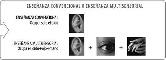 La secuencia anterior hace que el estudiante pase de una experiencia de aprendizaje monosensorial (solo oído) a una experiencia sensorial dual (oído y vista) y a una experiencia multisensorial (oído, vista, olfato, y tacto).