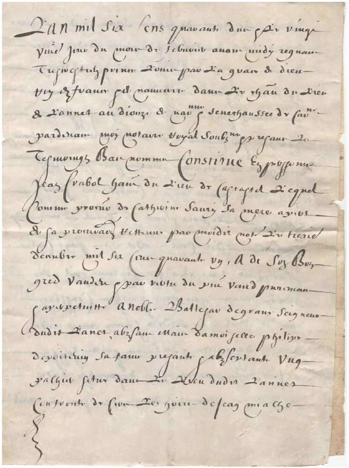 - Document 58 bis – 28 août 1613 – Pacte de mariage de Noble Pierre de Poitevin seigneur de la Bastide et de Demoiselle Gabrielle de Gouzens (pour Noble Pierre de Grave seigneur de Lanet contre Gabriel de Calmis seigneur de Baraigne et Demoiselle Marguerite de Poitevin mariés)