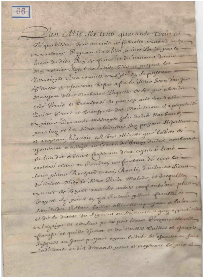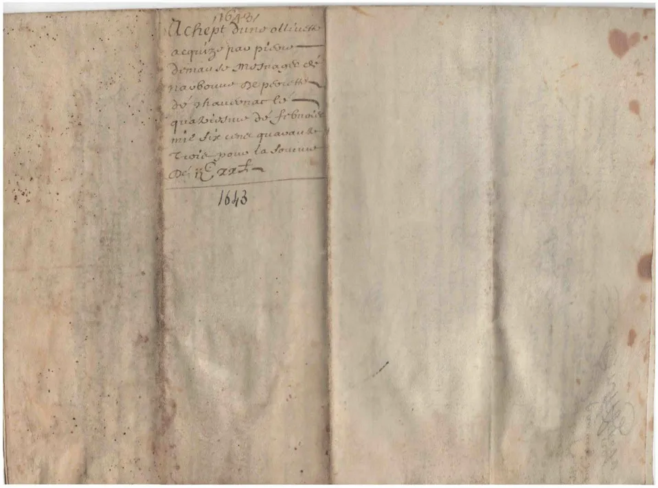 Document 88 – 4 février 1643 – Vente d'une olivette située à Narbonne par Pierrette de Chaucenac veuve de Jean d'Augar, à Pierre Demanso