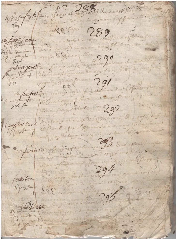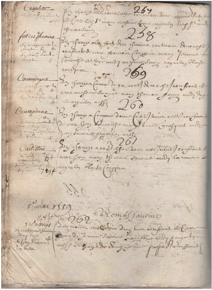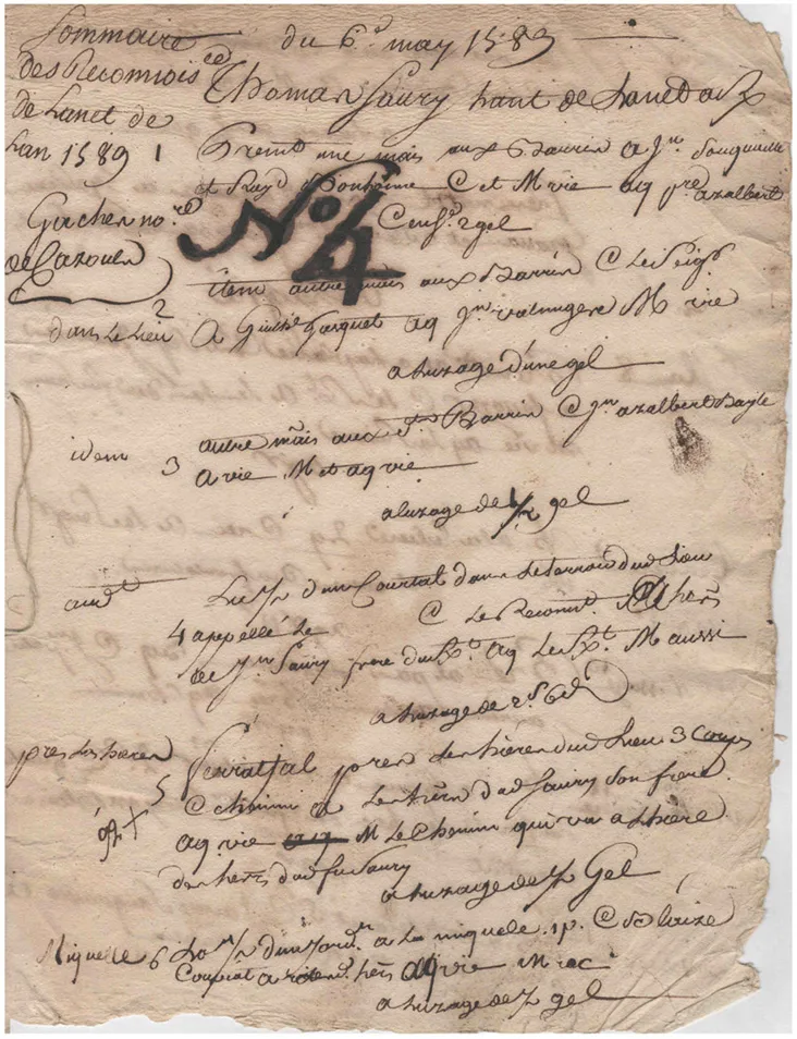 - Aud. [lieu]. La moitié d'un courtal dans le terroir dud. lieu appellé le ***.C : le reconnaissant. A : hoirs de Jean Saury, frère dud. reconnaissant. Aq : le reconnaissant. M : aussi. A l'uzage de 2 gélines.