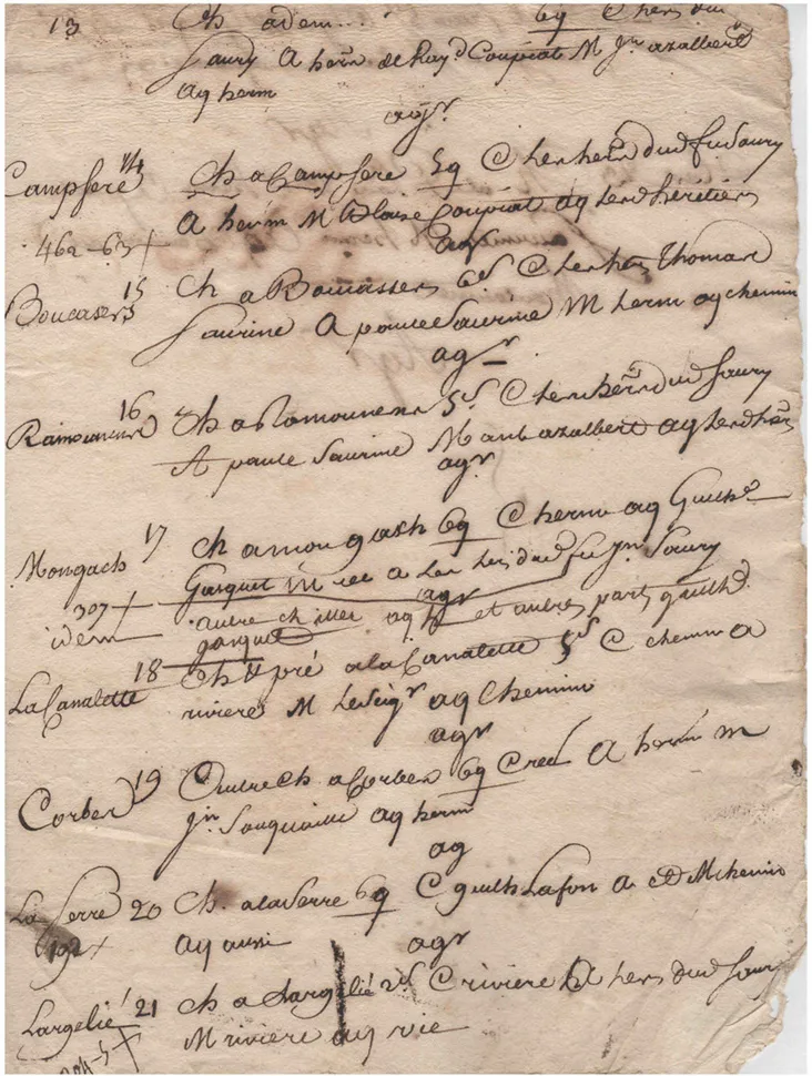 - Largelié. Champ a Largilié, 2 sous. C : riviere. A : hers dud. Saury. M : riviere. Aq : vie
