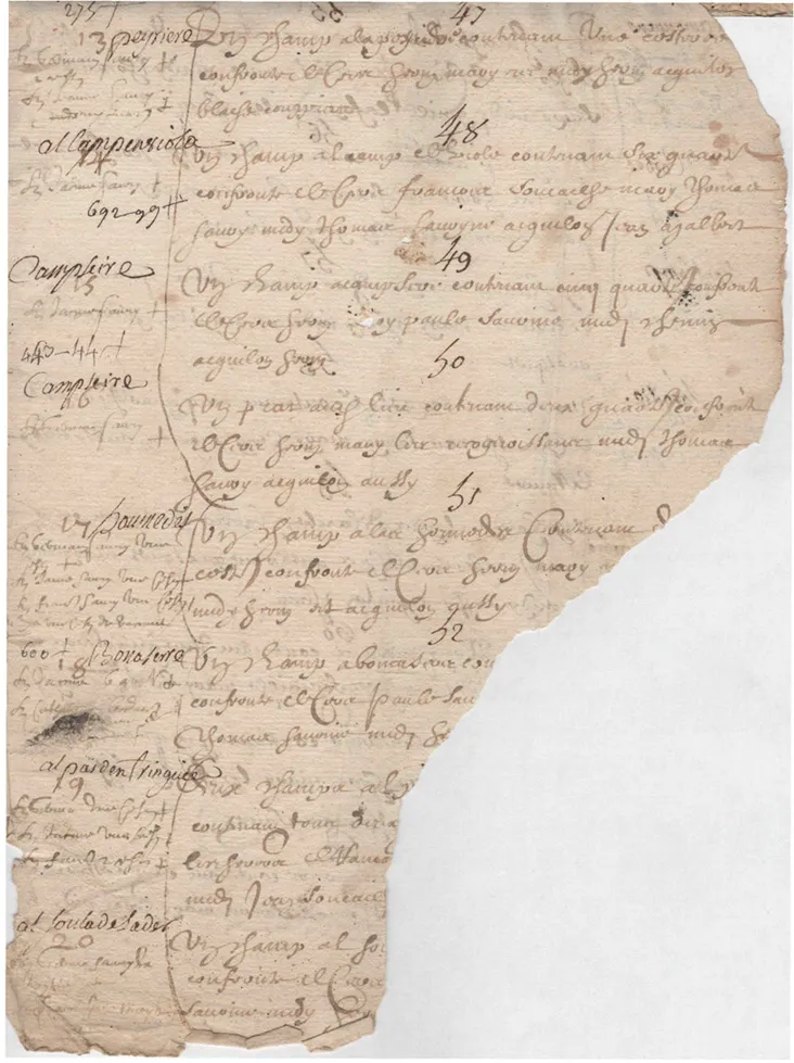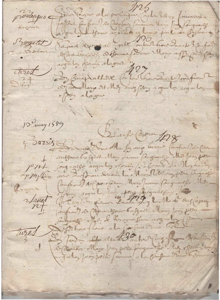 - Campsere. Champ a Campsere, 5 quarterées. C : les héritiers dud. feu Saury. A : herm. M : Blaise Coupiat. Aq : lesd. héritiers. Agrie.