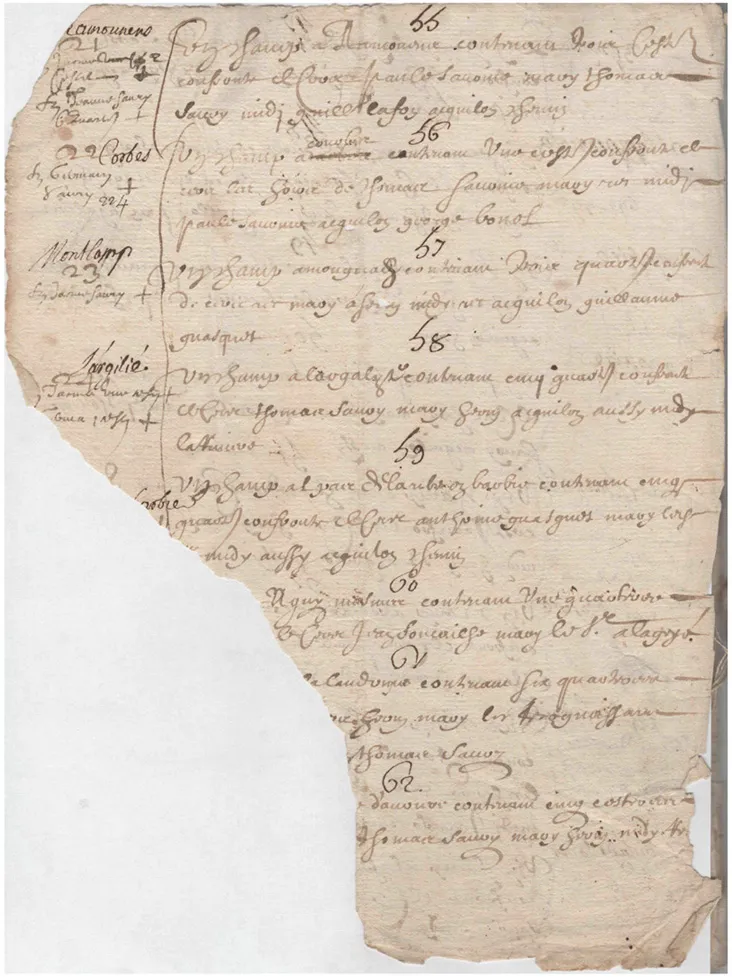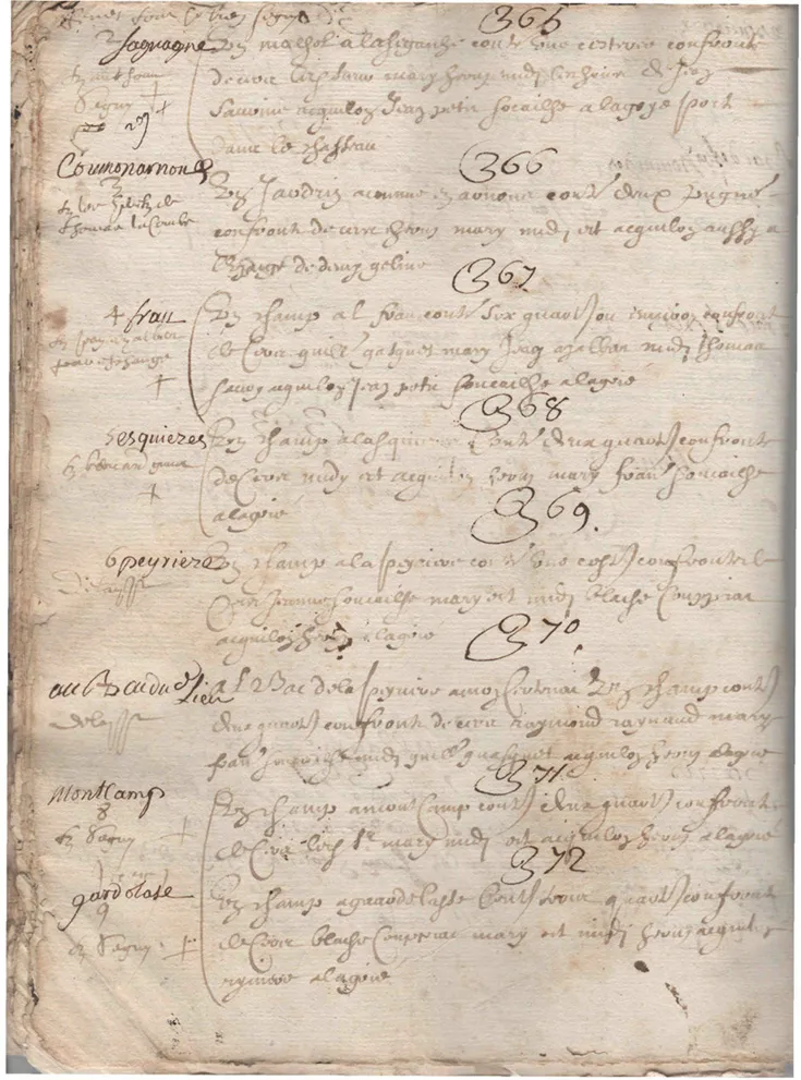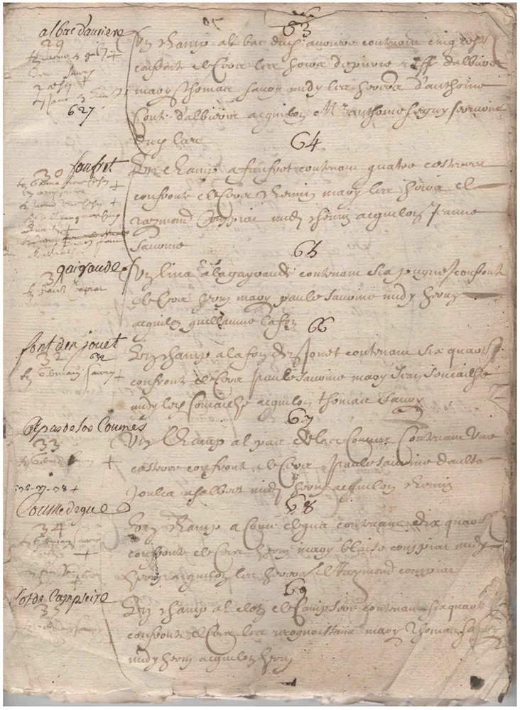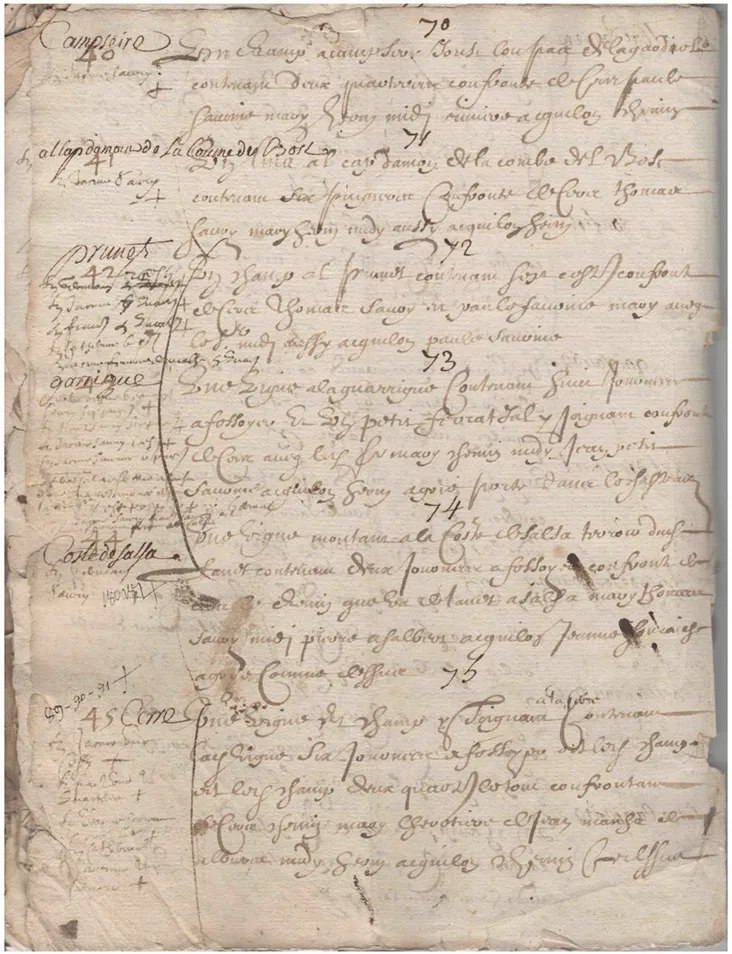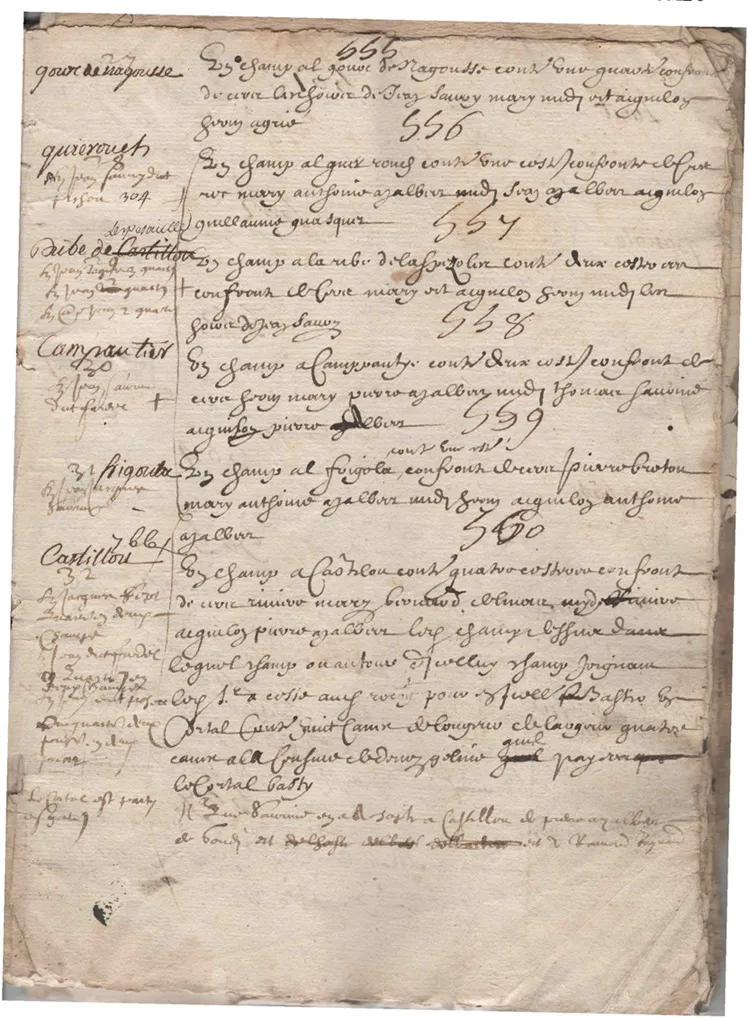 - Mongach. Champ a Mongasch, 6 quarterées. C : hérin. Aq : Guilhaume Gasquet. M : rec. A : les héritiers dud. feu Jean Saury. idem. Autre champ illec. Aq et aultres parts : Gaultier,