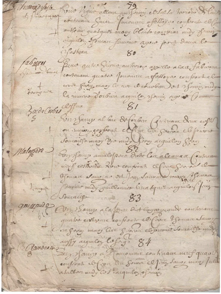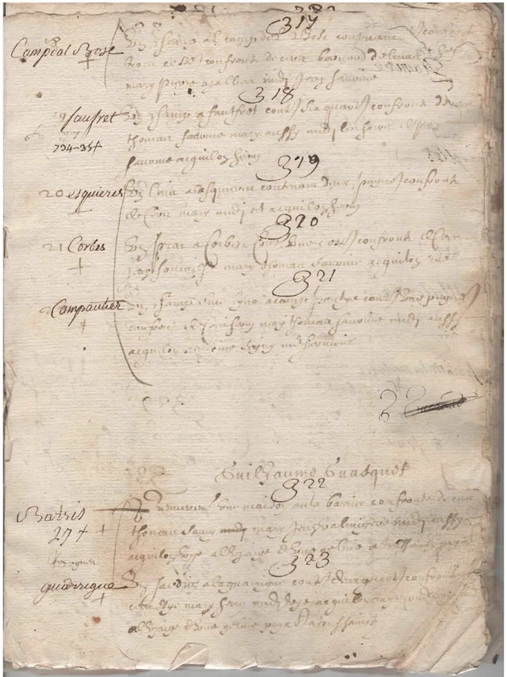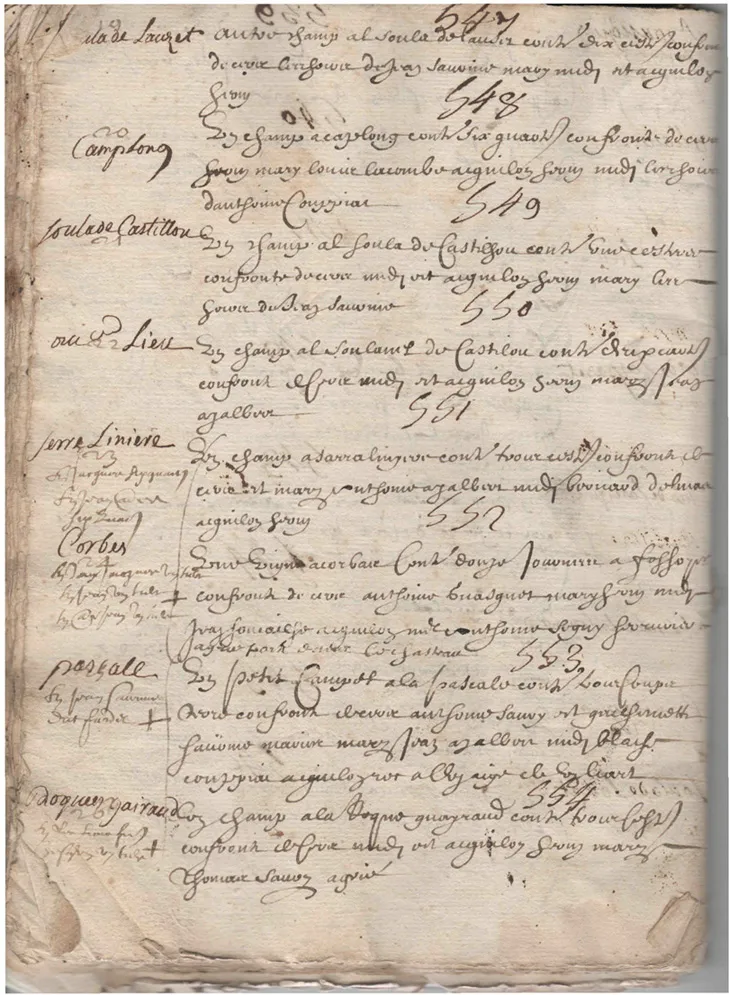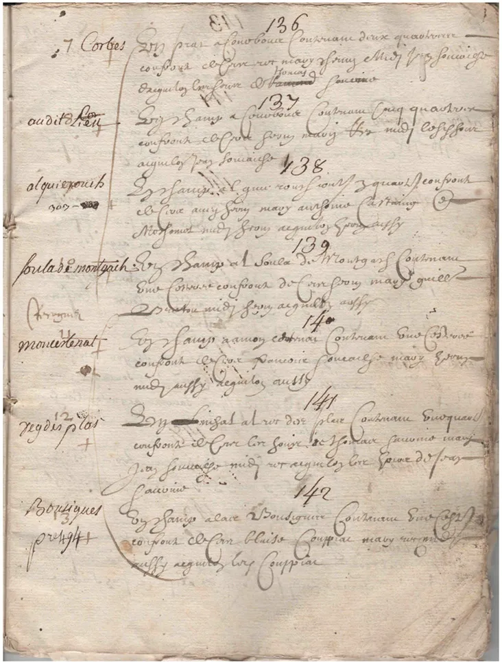 - Corbes. Autre champ a Corbes, 6 quarterées. C : rec, A : herm, M : Jean Souquaille, Aq : herm. Agrie.