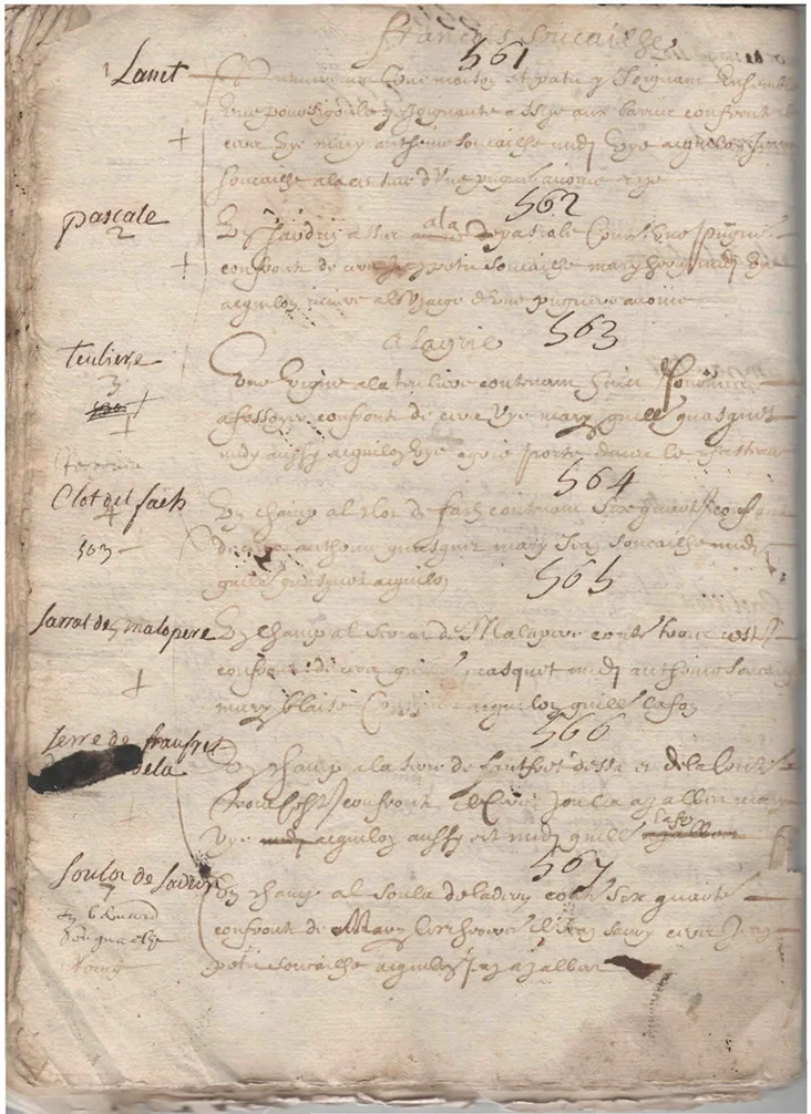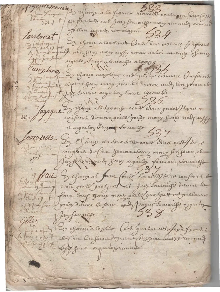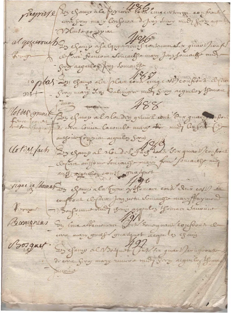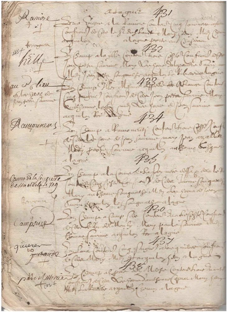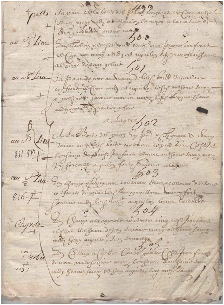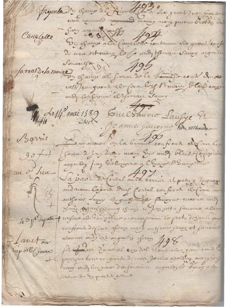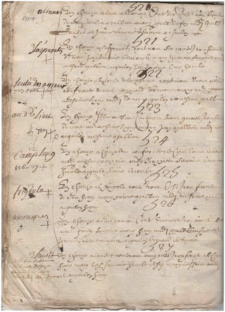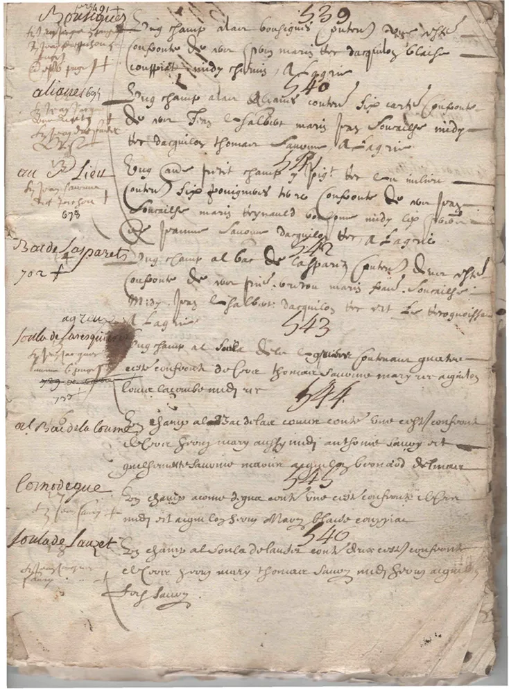 - Plas. Champ als Plas, 2 sous. C : herm, A : Paule Saurine. M : hérin. Aq : chemin de Mouloumet. Agrie.