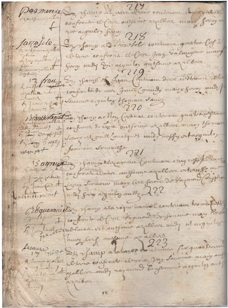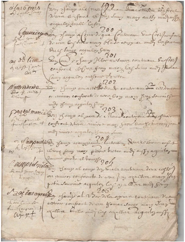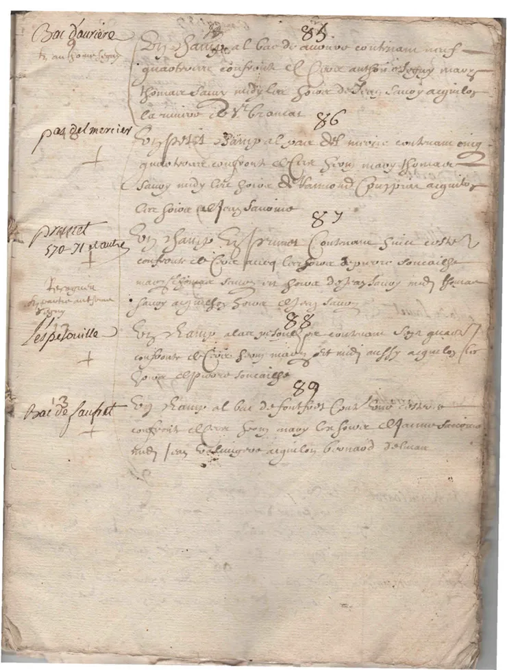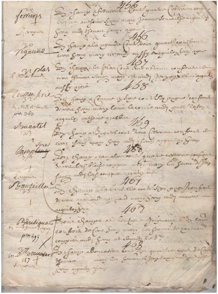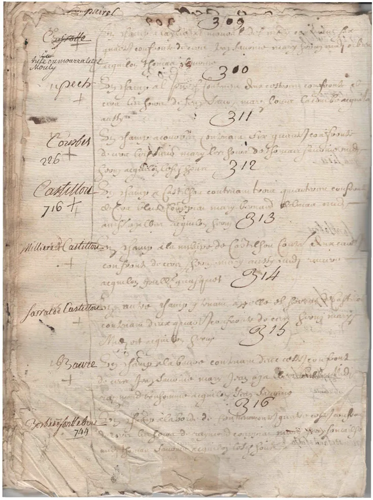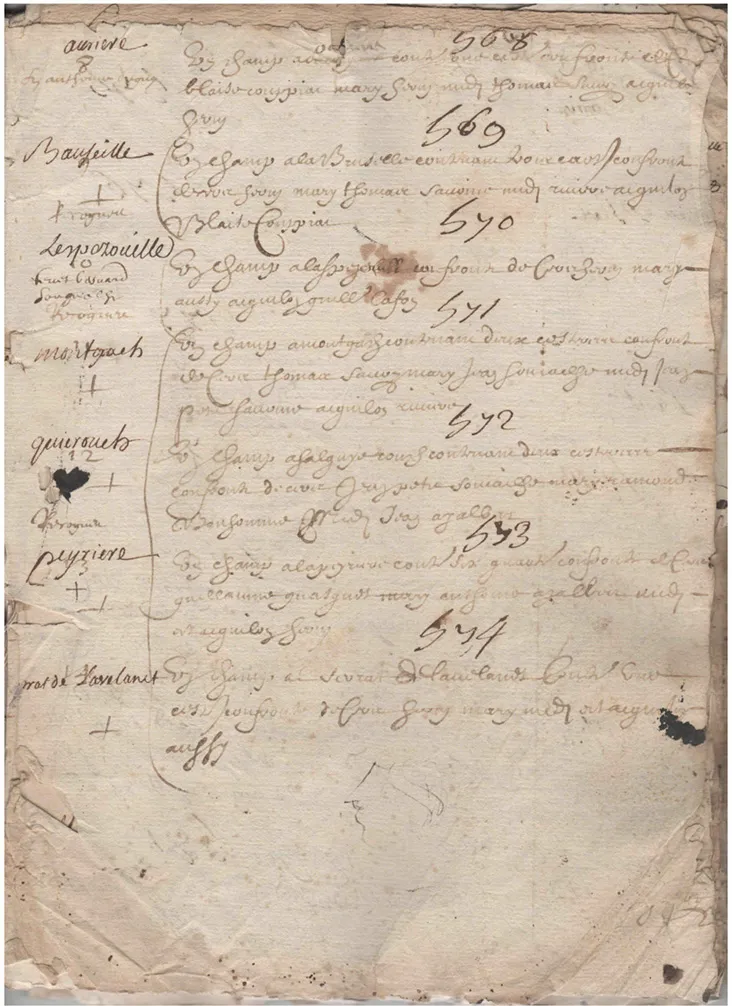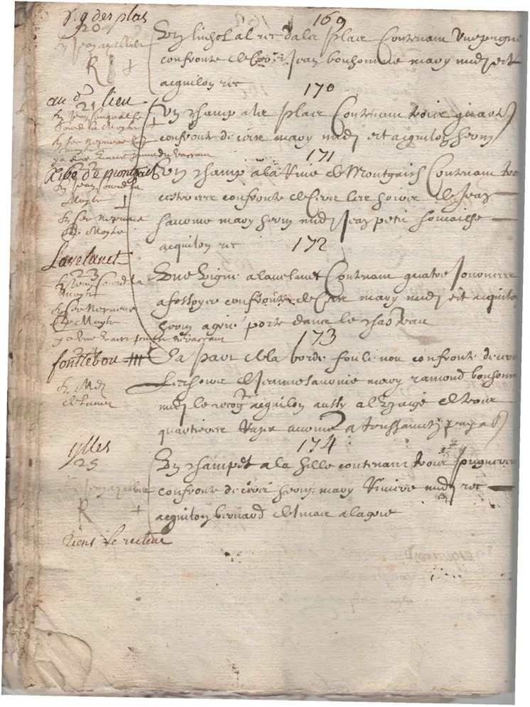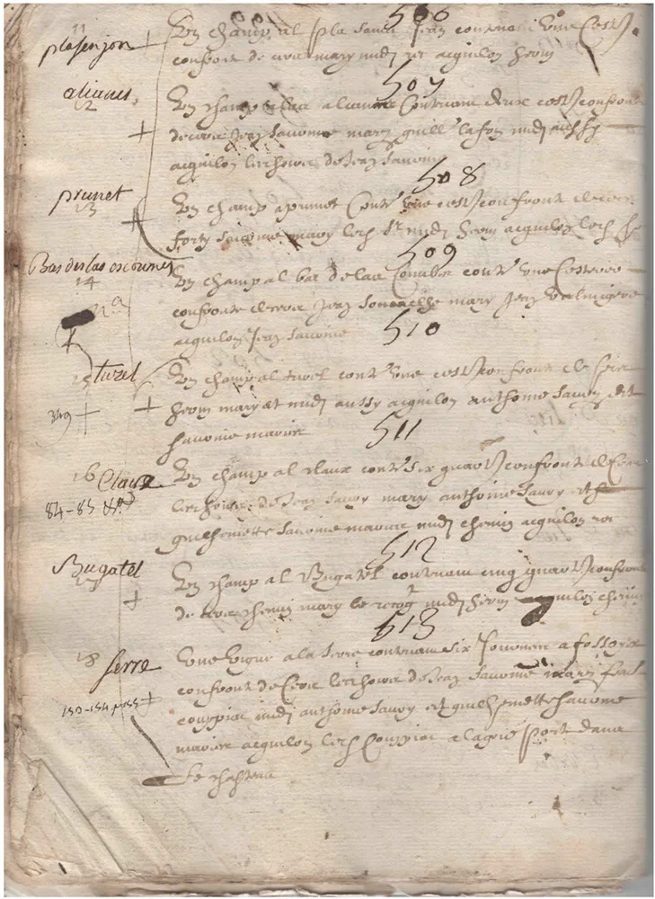 - Plas. Champ als Plas, 2 sous. C : herm, A : Paule Saurine. M : hérin. Aq : chemin de Mouloumet. Agrie.