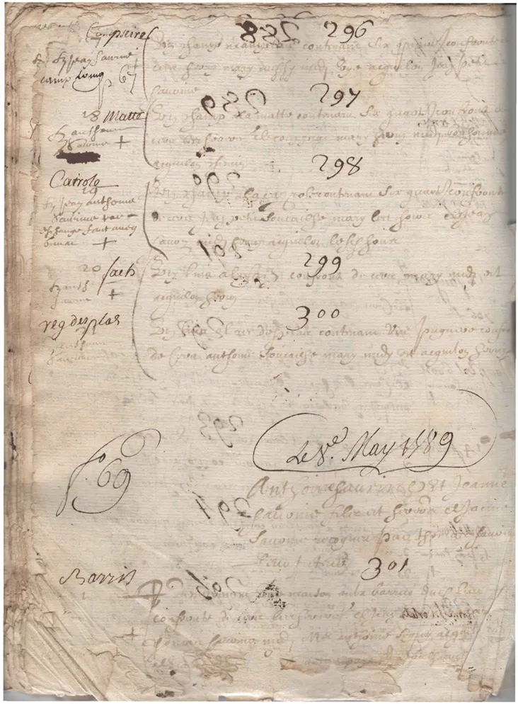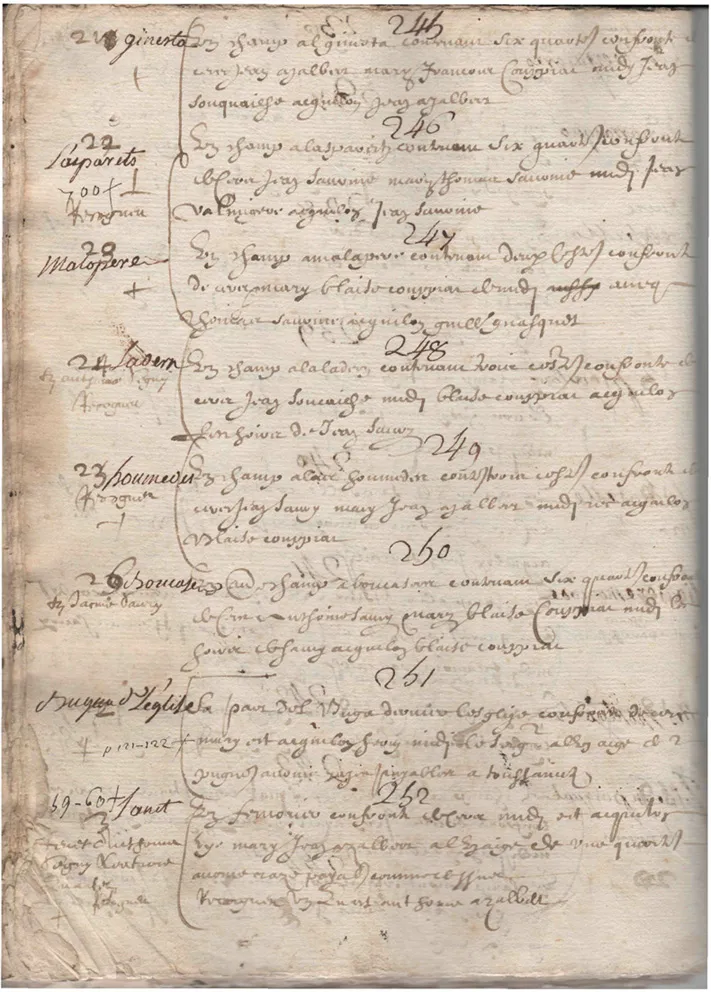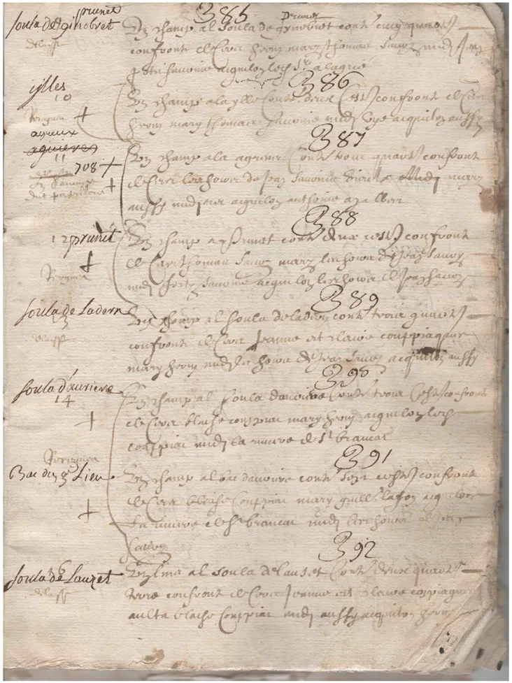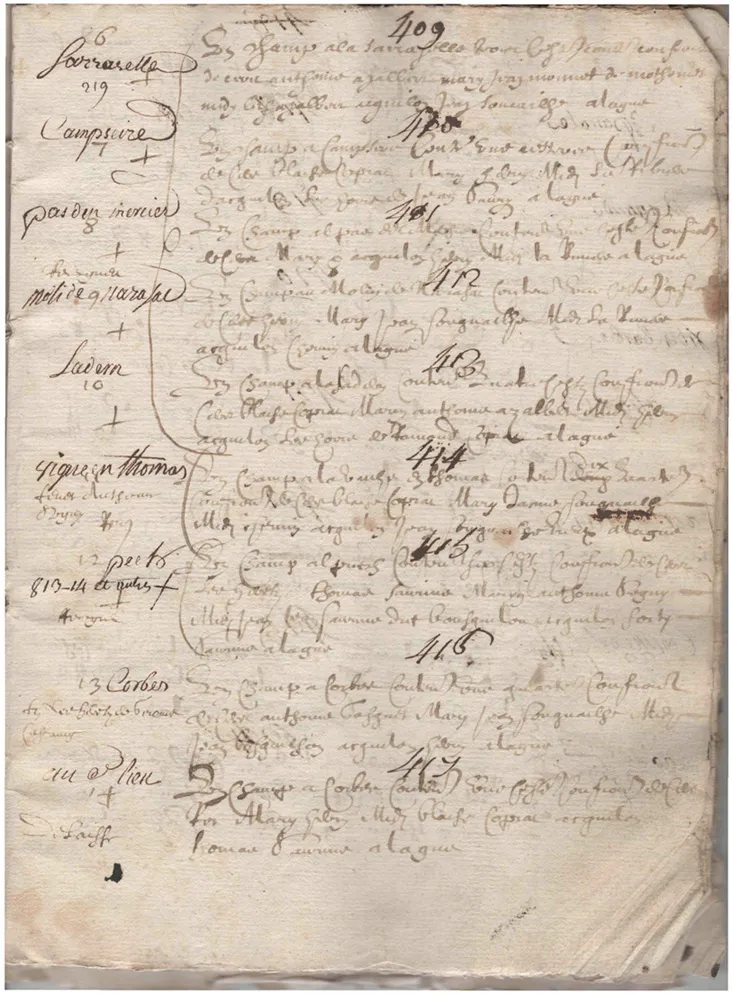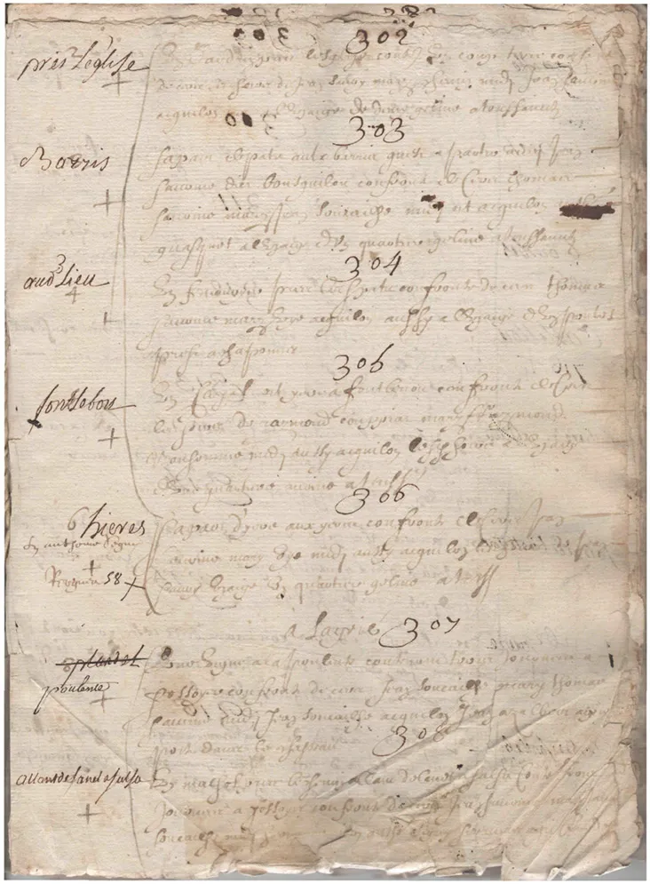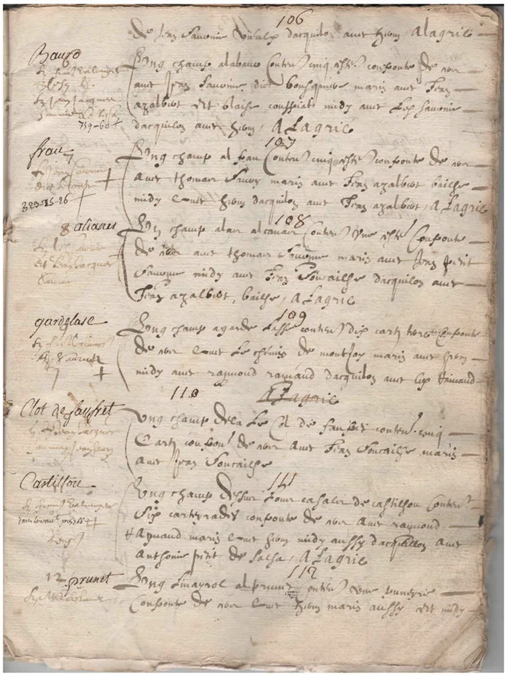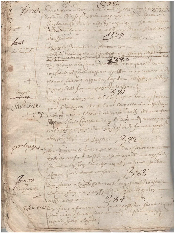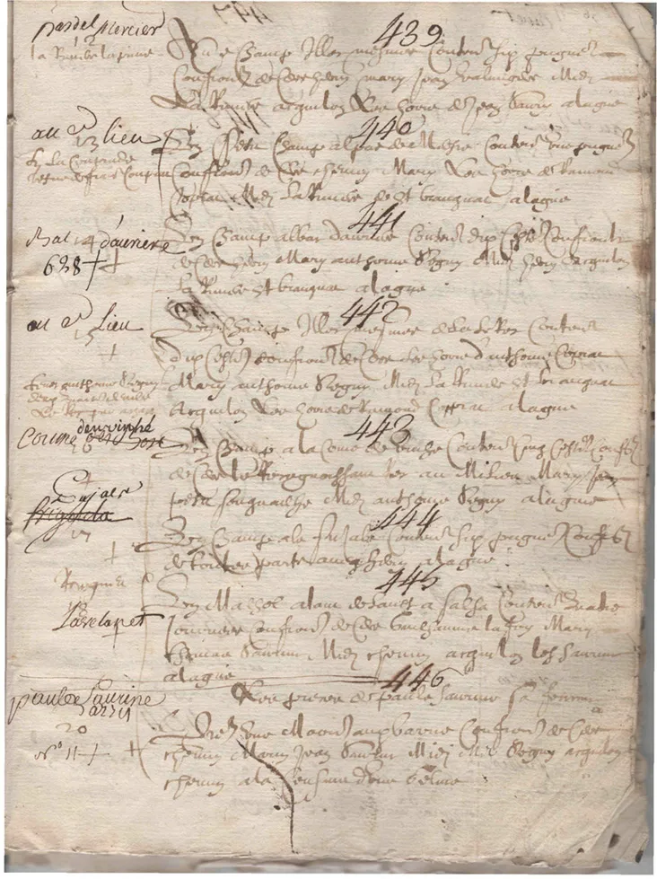 - Plas. Champ als Plas, 2 sous. C : herm, A : Paule Saurine. M : hérin. Aq : chemin de Mouloumet. Agrie.
