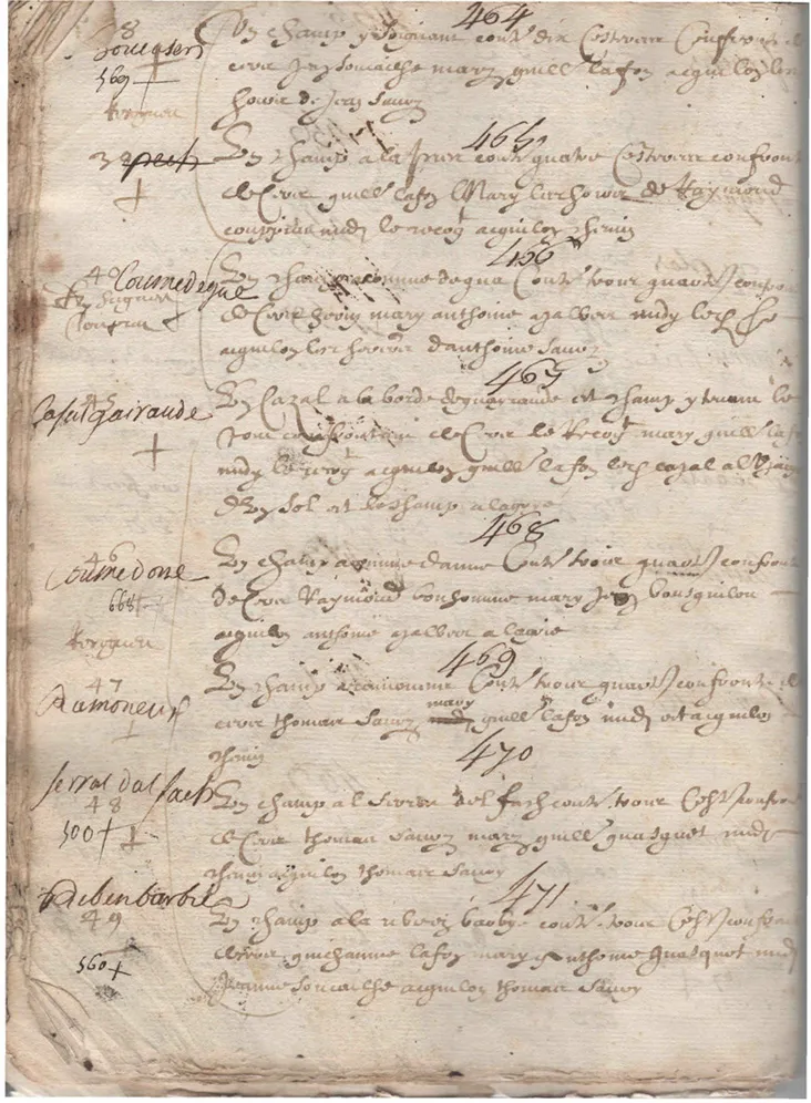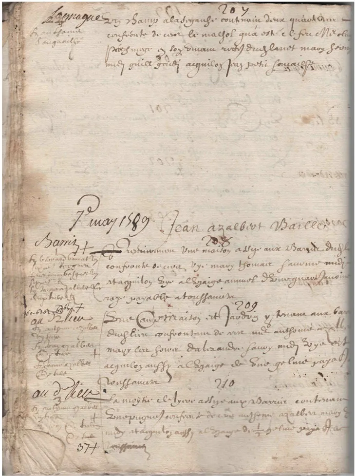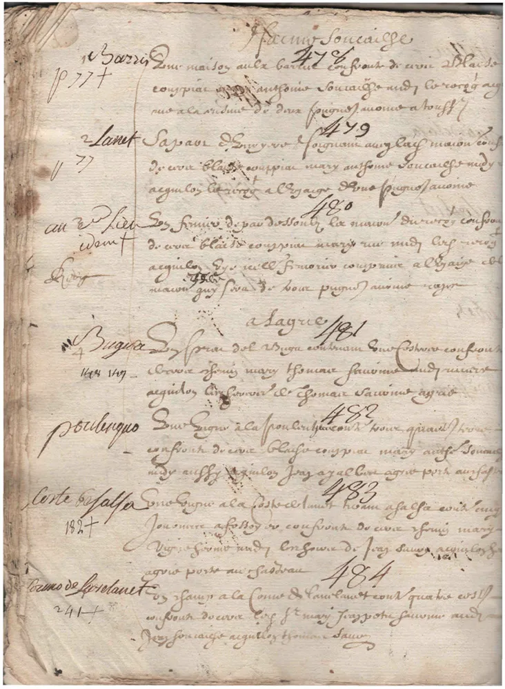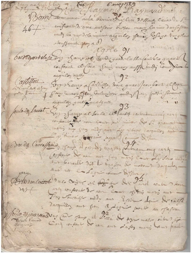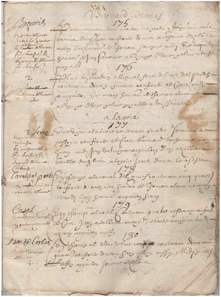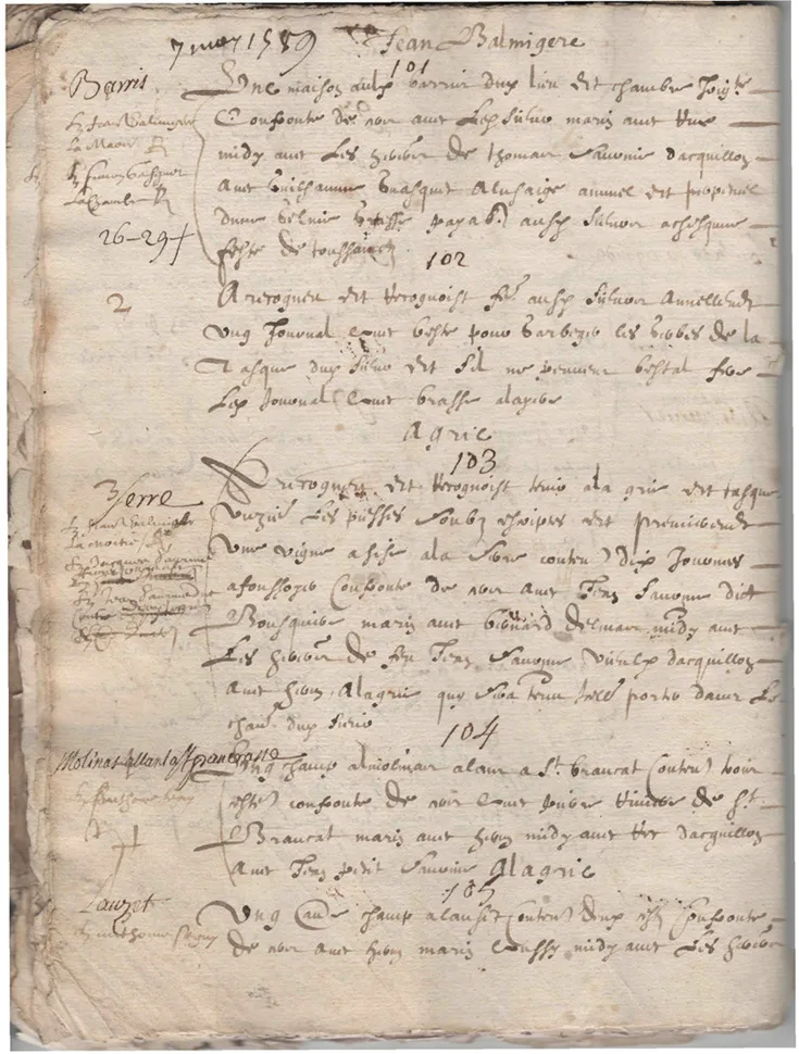- Premierement, une maison aux Barris. A[ulta] : Jean Souquaille et Raymond Bonhomme, C[ers] et M[idi] : vie, Aq[uilon] : Pierre Azalbert, Censive : 2 gélines.