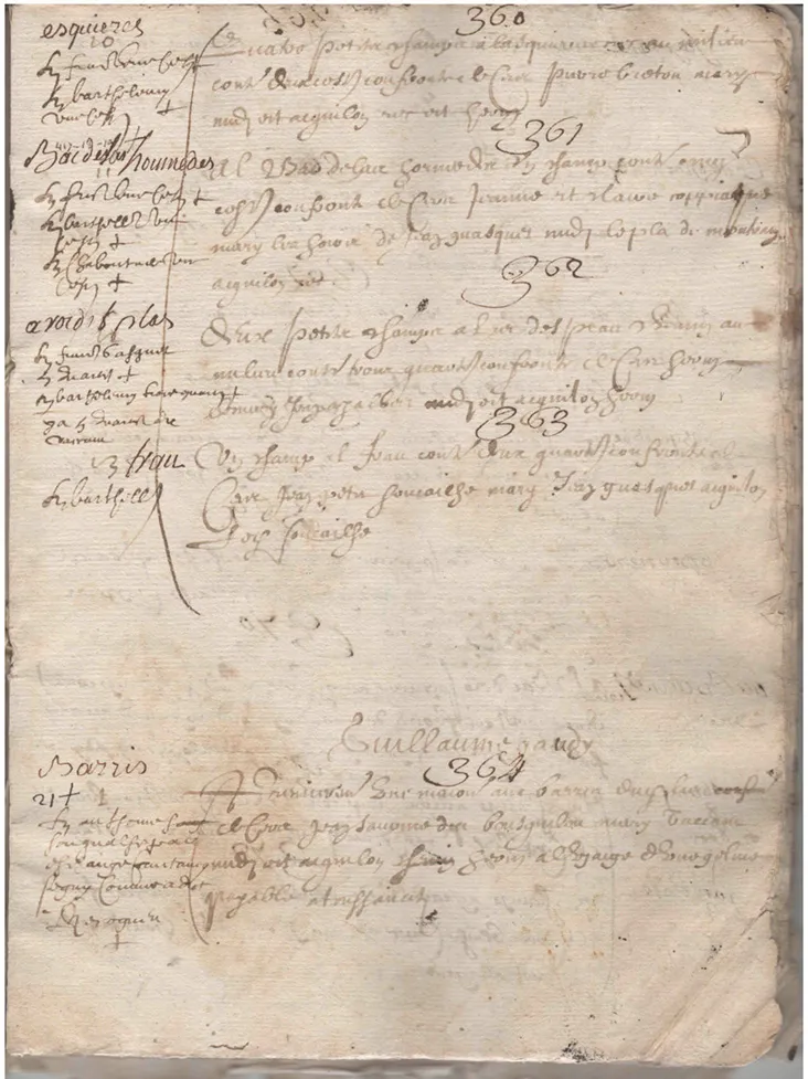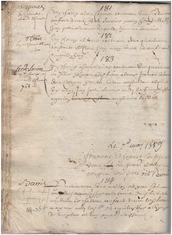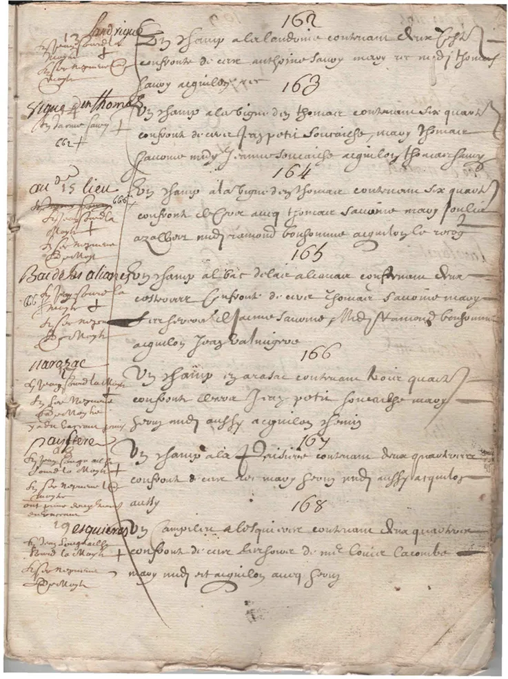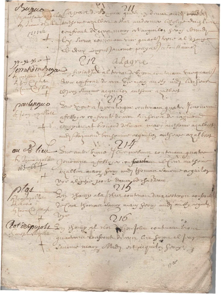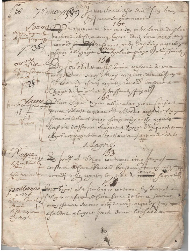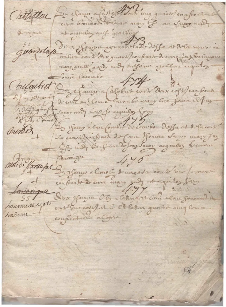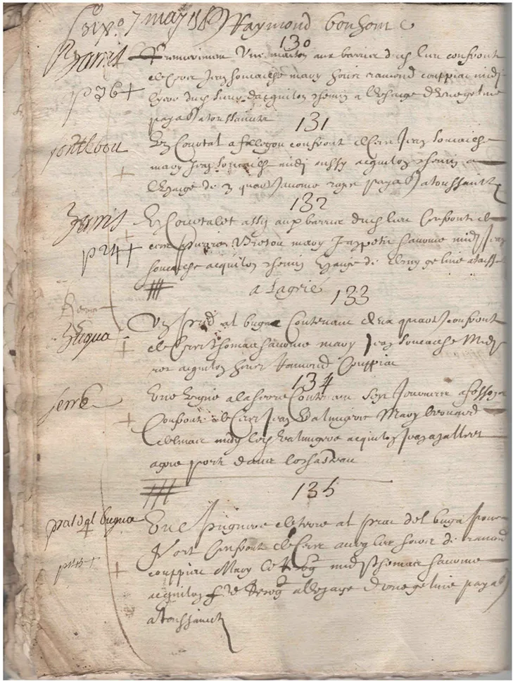 - Premierement, une maison aux Barris. A[ulta] : Jean Souquaille et Raymond Bonhomme, C[ers] et M[idi] : vie, Aq[uilon] : Pierre Azalbert, Censive : 2 gélines.