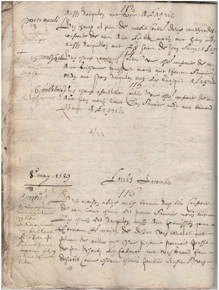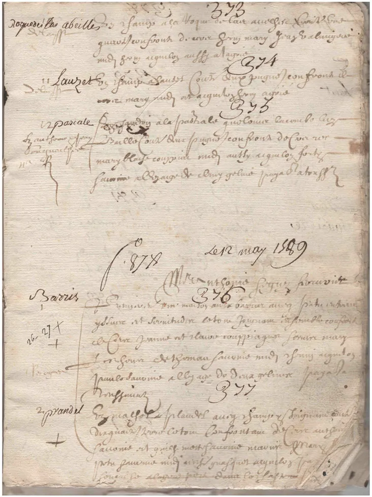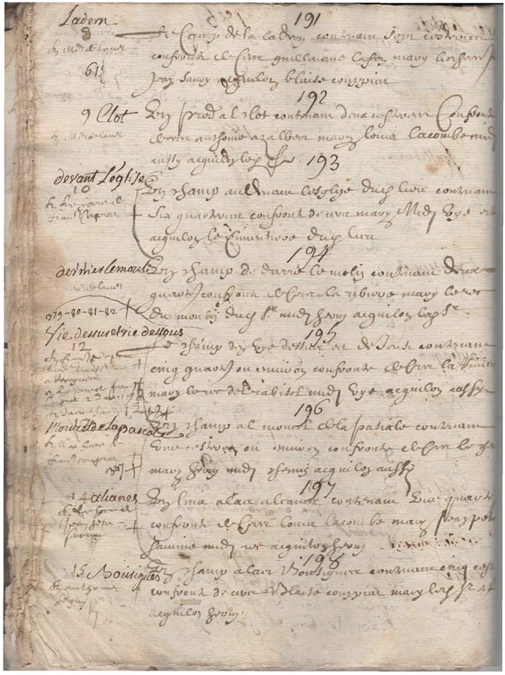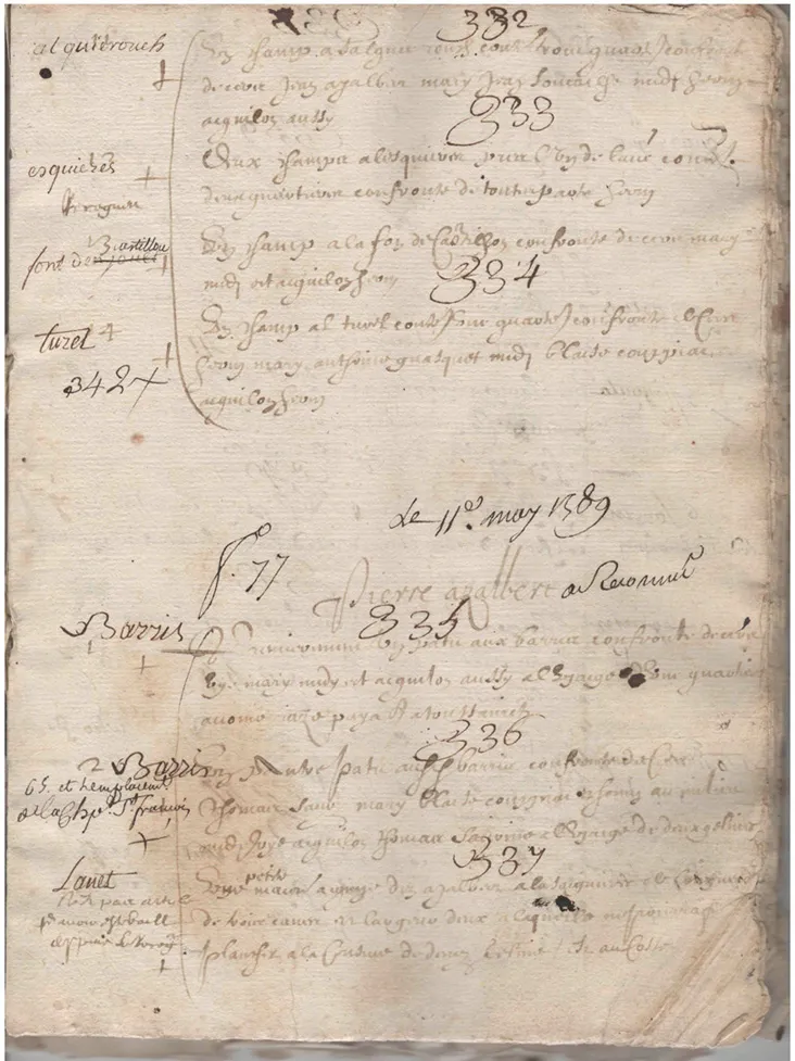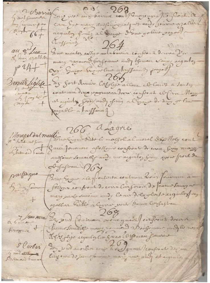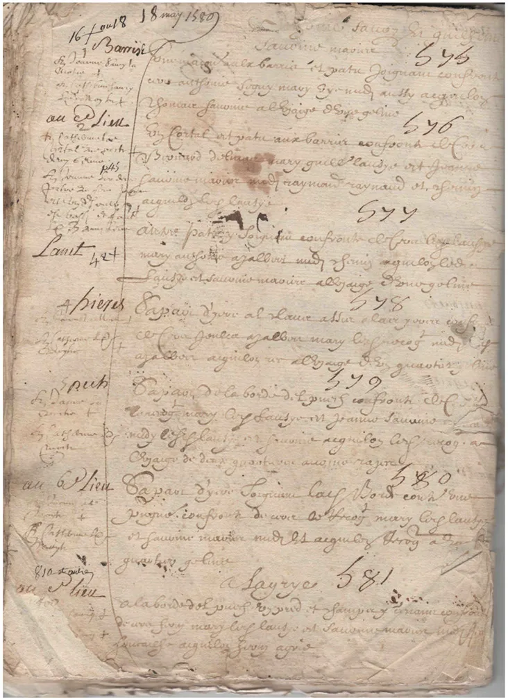 - Premierement, une maison aux Barris. A[ulta] : Jean Souquaille et Raymond Bonhomme, C[ers] et M[idi] : vie, Aq[uilon] : Pierre Azalbert, Censive : 2 gélines.