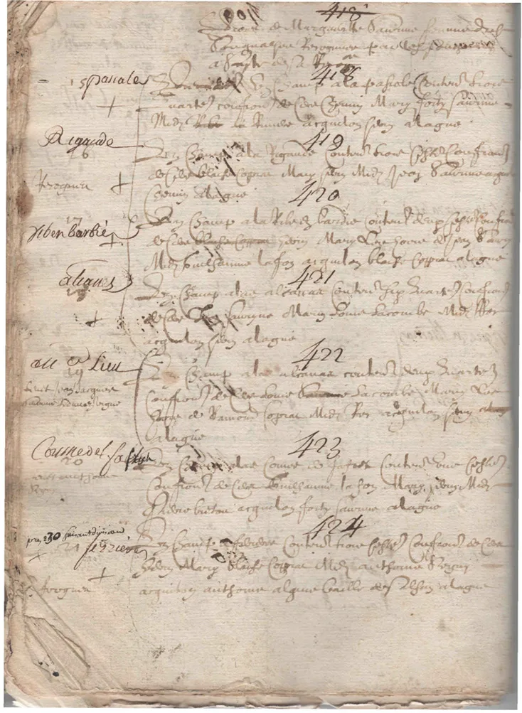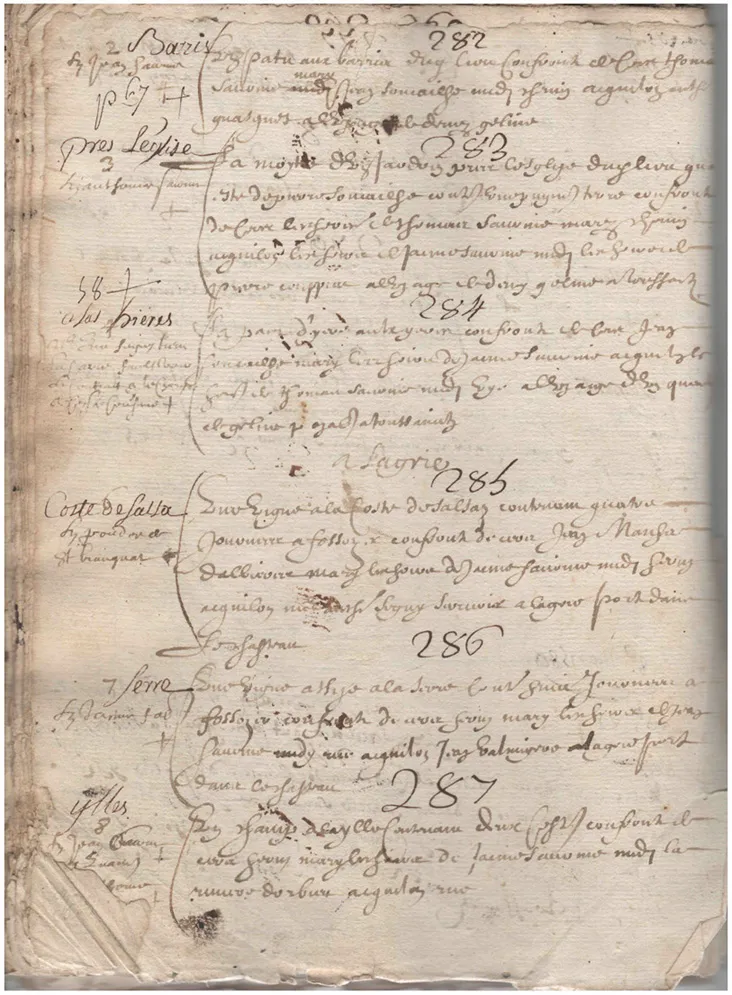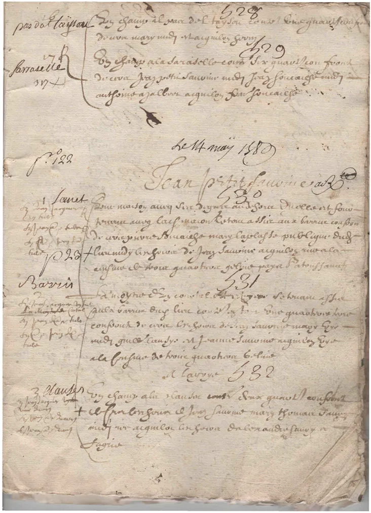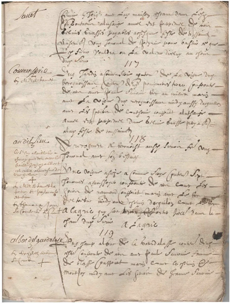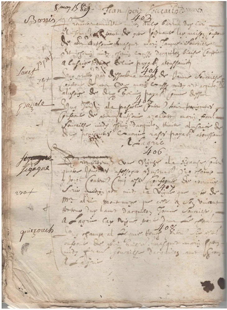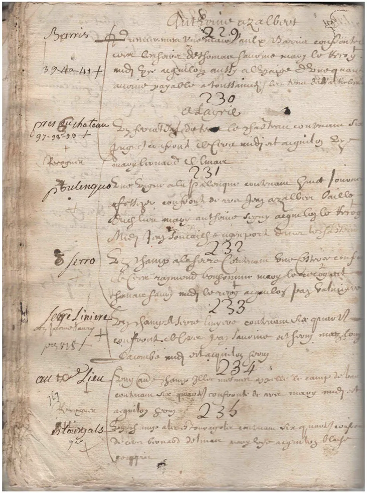 - Barris, Item une aire aus Barris contenant 3 cesterées. C : . les susd. héritiers dud. Saury. A, M et Aq : vie. A Î'uzage de ½ géline. Revenant les susd. uzages a 5 gélines grasses et 2 sous 6 deniers 0 [...] payables a la Toutssaincts. A l'agrie.