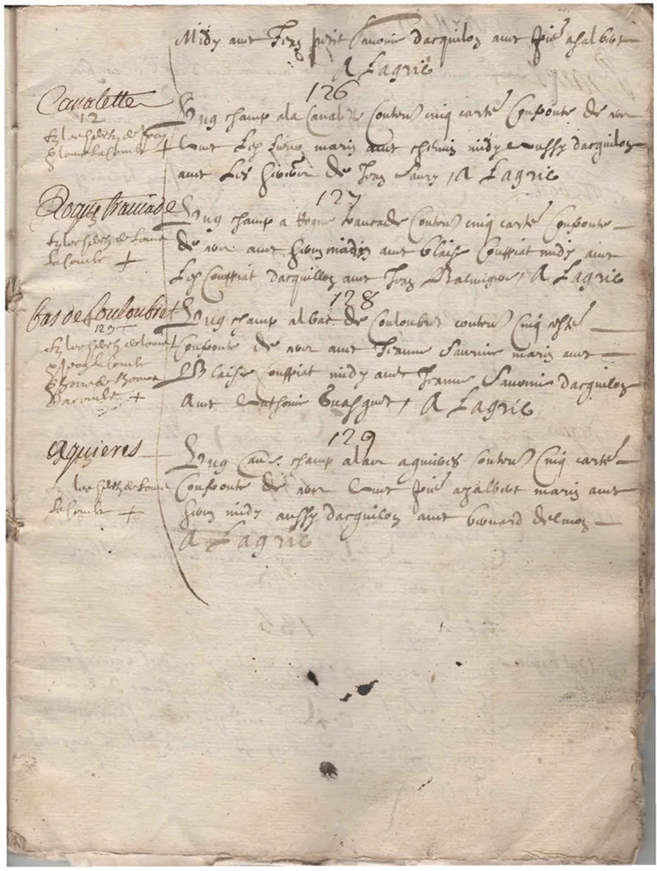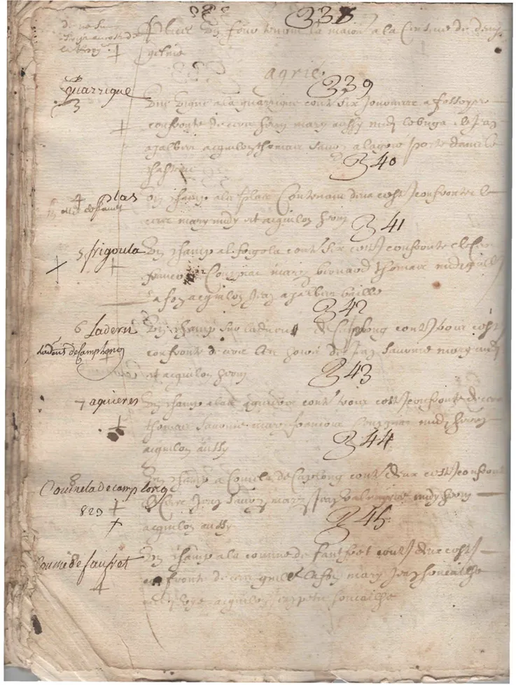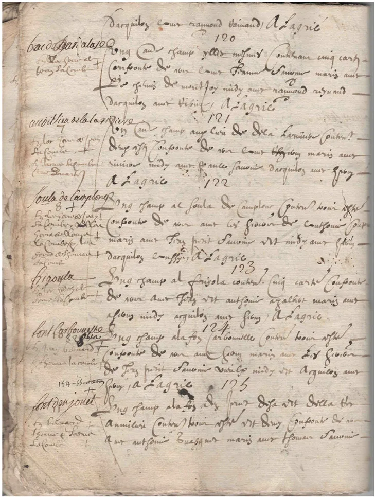 - La Serre. Champ a La Serre, 6 quarterées. C : Guilhaume Lafon. A et M : chemin. Aq aussi. Agrie.