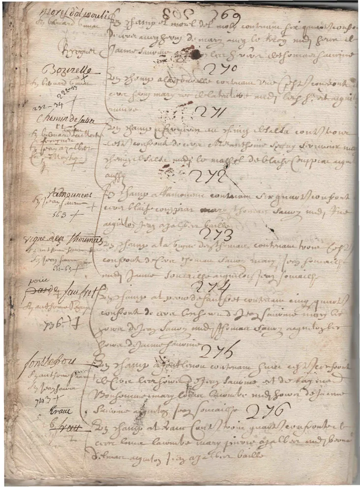 - Pas Nassage. Pré al Pas Nassasca, 3 quartereées. C : Jean Petit Saurine. A : chemin, M : rec. Aq : chemin. Agrie.