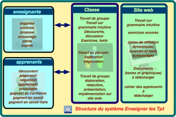 Le système concerne aussi bien les apprenants que les enseignantes. Il se répartit sur le travail en classe d’une part, et celui qui nécessite l’emploi d’un ordinateur.