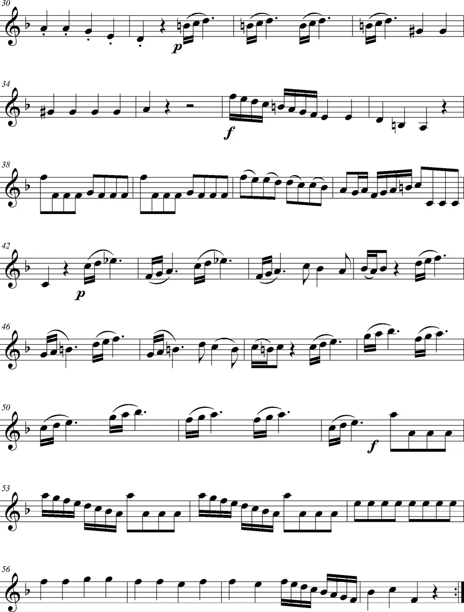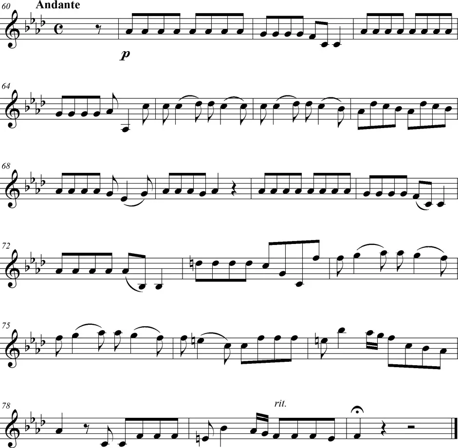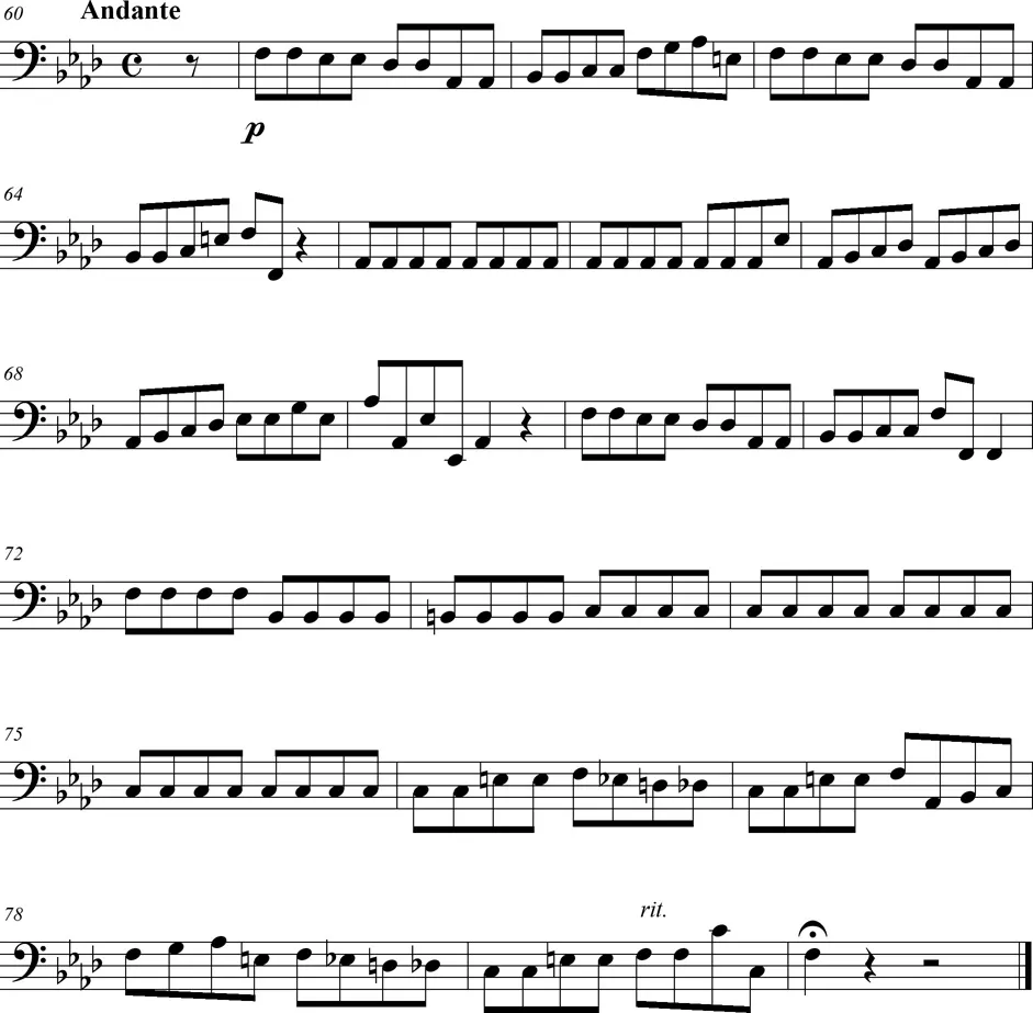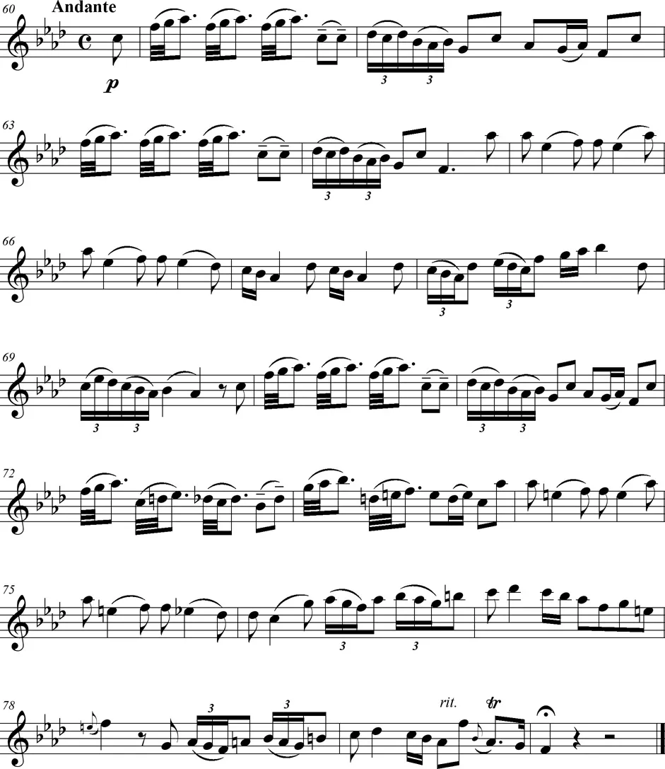 Une pièce pour deux violons et violoncelle de style intermédiaire entre le baroque et le classique, en trois mouvements.