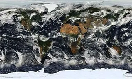 « planisphère montrant la terre telle qu'elle a été observée par le satellite MODIS, le 11/07/2005. Les petits trous dans la couverture de MODIS ont été comblés par des données provenant de satellites GOES , et la dernière version de la Blue Marble (Bille Bleue) de la Nasa. » Source : Earth's Vital Signs Wikipedia