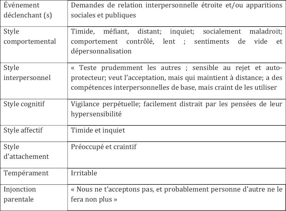 Tableau 2 : Les caractéristiques cliniques nécessaires à la conceptualisation du trouble de personnalité évitante sont résumées dans ce tableau.