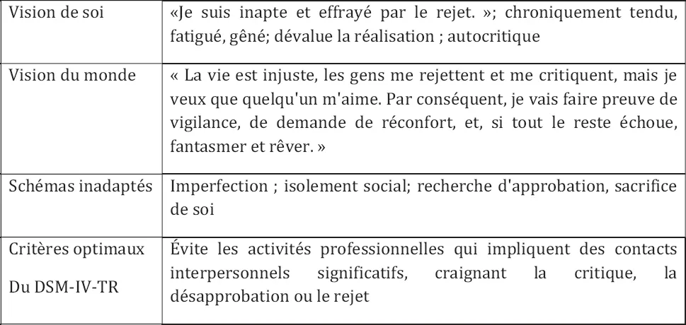 | Vision de soi | «Je suis inapte et effrayé par le rejet. »; chroniquement tendu, fatigué, gêné; dévalue la réalisation ; autocritique |