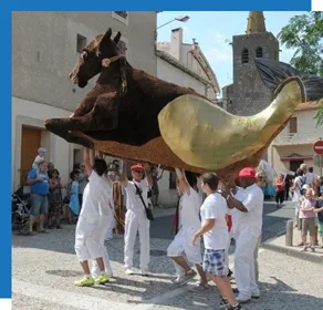 Ce poulain (lou pouli en occitan), porte sur son dos deux personnages : Estinou et Estinnette. L’histoire d’Estinou et d’Estinnette, remonte au XVIIe siècle, lorsque le roi Louis XIII est de passage avec le maréchal De Bassompierre. Alors que celui-ci passe la Peyne sur son cheval il aperçoit une jeune paysanne relevant ses jupons pour traverser la rivière. Le galant maréchal la prend sur son cheval et ils rentrent en ville.