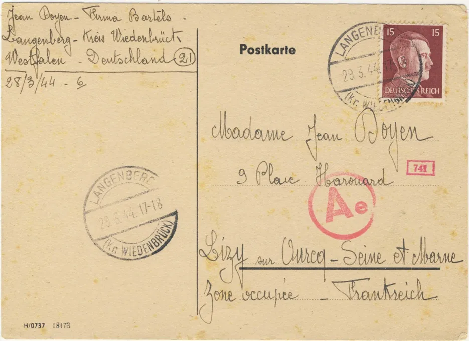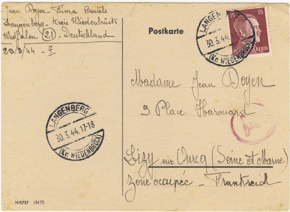 | Jean Doyen - Firma Bartels Langenberg - Kreis Wiedenbrück Westfalen - Deutschland 21 28/3/44 - 6 | Madame Jean Doyen 9 Place Harouard Lizy-sur-Ourcq - Seine et Marne Zone occupée - Frankreich |