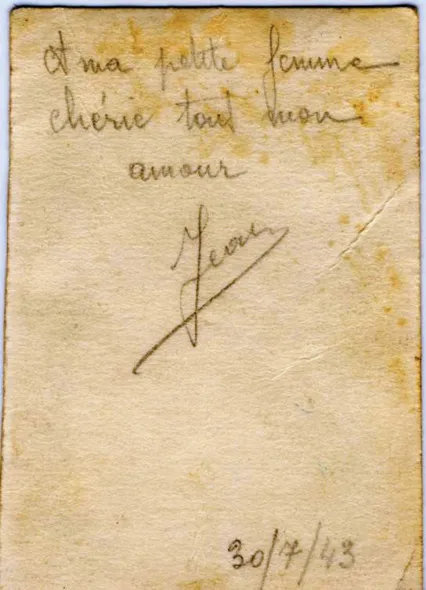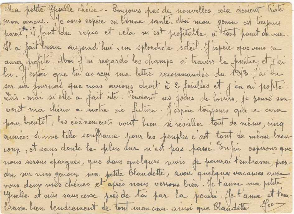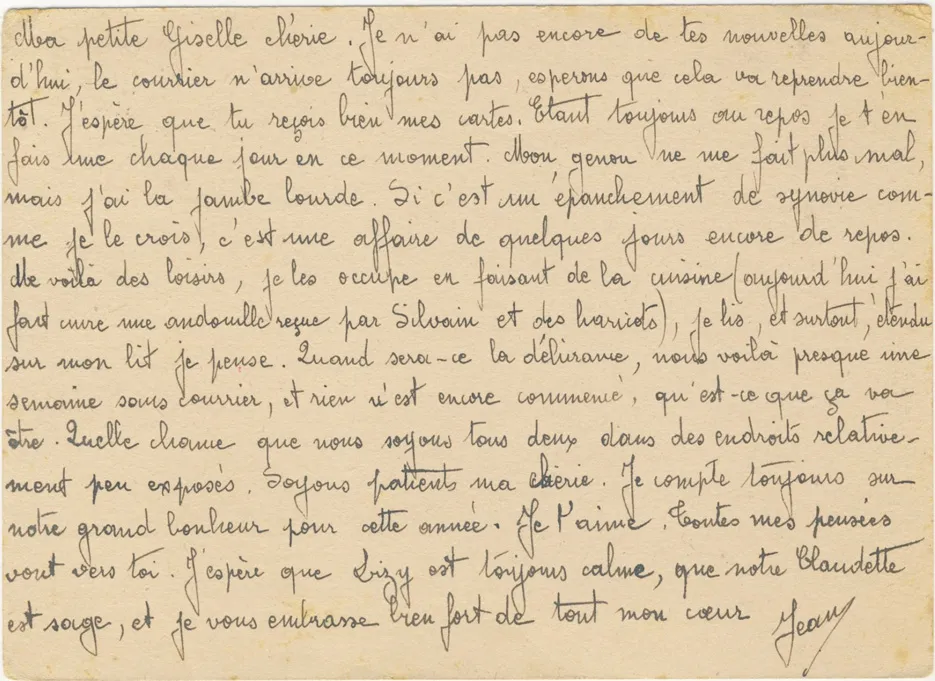 | Ma petite Giselle chérie. Je n'ai pas encore de tes nouvelles aujourd'hui, le courrier n'arrive toujours pas, espérons que cela va reprendre bientôt. J'espère que tu reçois bien mes cartes. Etant toujours au repos je t'en fais une chaque jour en ce moment. Mon genou ne me fait plus mal, mais j'ai la jambe lourde. Si c'est un épanchement de synovie comme je le crois, c'est une affaire de quelques jours encore de repos. Me voilà des loisirs, je les occupe en faisant de la cuisine (aujourd'hui j'ai fait cuire une andouille reçue par Silvain et des haricots), je lis, et surtout, étendu sur mon lit je pense. Quand sera-ce la délivrance, nous voilà presque une semaine sans courrier, et rien n'est encore commencé, qu'est-ce que ça va être. Quelle chance que nous soyons tous deux dans des endroits relativement peu exposés. Soyons patients ma chérie. Je compte toujours sur notre grand bonheur pour cette année. Je t'aime. Toutes mes pensées vont vers toi. J'espère que Lizy est toujours calme, que notre Claudette est sage, et je vous embrasse bien fort de tout mon coeur. Jean | |