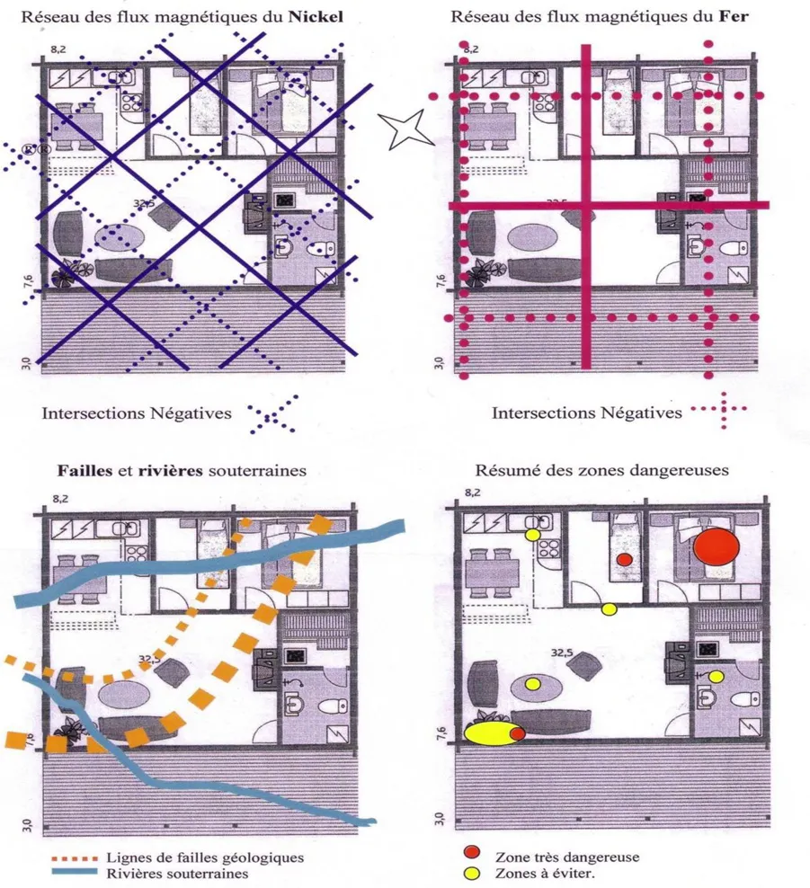 Les points magnétiques dévitalisants pour l'homme (noirs) se créent aux intersections négatives des réseaux magnétiques du nickel ou du fer, lorsqu'ils se superposent à plusieurs autres phénomènes souterrains perturbants : rivières (naturelles ou artificielles comme les égouts), failles géologiques, glissements de terrain, cavités, caveaux etc.