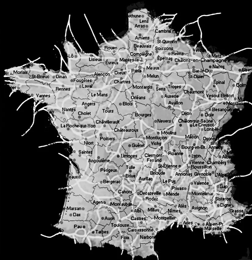 Le schéma suivant montre les réseaux telluriques principaux de France. Il est aisé de constater que les villes sont toutes construites sur ces réseaux, et les plus grandes et plus anciennes sont presque toutes sur des intersections de réseaux.