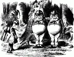 Ils ressemblaient tellement à deux grands écoliers qu'Alice ne put s'empêcher de montrer Bonnet Blanc du doigt en disant :