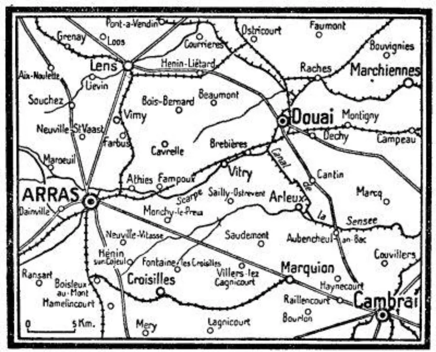 La bataille dâArras se dĂ©roulera sur une ligne partant de Loos au Nord, vers QuĂ©ant au Sud, passant la Scarpe qui, prĂšs de Blangy, coupe vers lâest nos lignes en deux zones. La partie au Nord de la Scarpe est une campagne de collines qui se transforme en plateau au Nord de Givenchy puis retombe vers lâEst dans une plaine dĂ©nudĂ©e, dans laquelle sâĂ©rige la ville de Douai. Au Sud de la Scarpe le vallonnement est plus prononcĂ©. Au creux des vallĂ©es, marais et boqueteaux boisĂ©s complĂštent le paysage. Parmi les routes qui sâĂ©talent telles des pattes dâaraignĂ©e, celle dâArras â Cavrelle â Douai ainsi quâau Sud celle dâArras â Cambrai prirent de lâimportance durant les combats Ă venir.