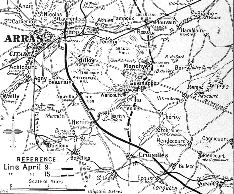 La bataille dâArras (First Battle of the Scarpe) devait dĂ©buter primitivement en mars. Le dĂ©placement en repli de lâarmĂ©e allemande (environ 1 mile œ) dans des abris fortifiĂ©s construits derriĂšre lâancienne ligne de front, laissa des points comme Beaurains dans les mains des Anglais.