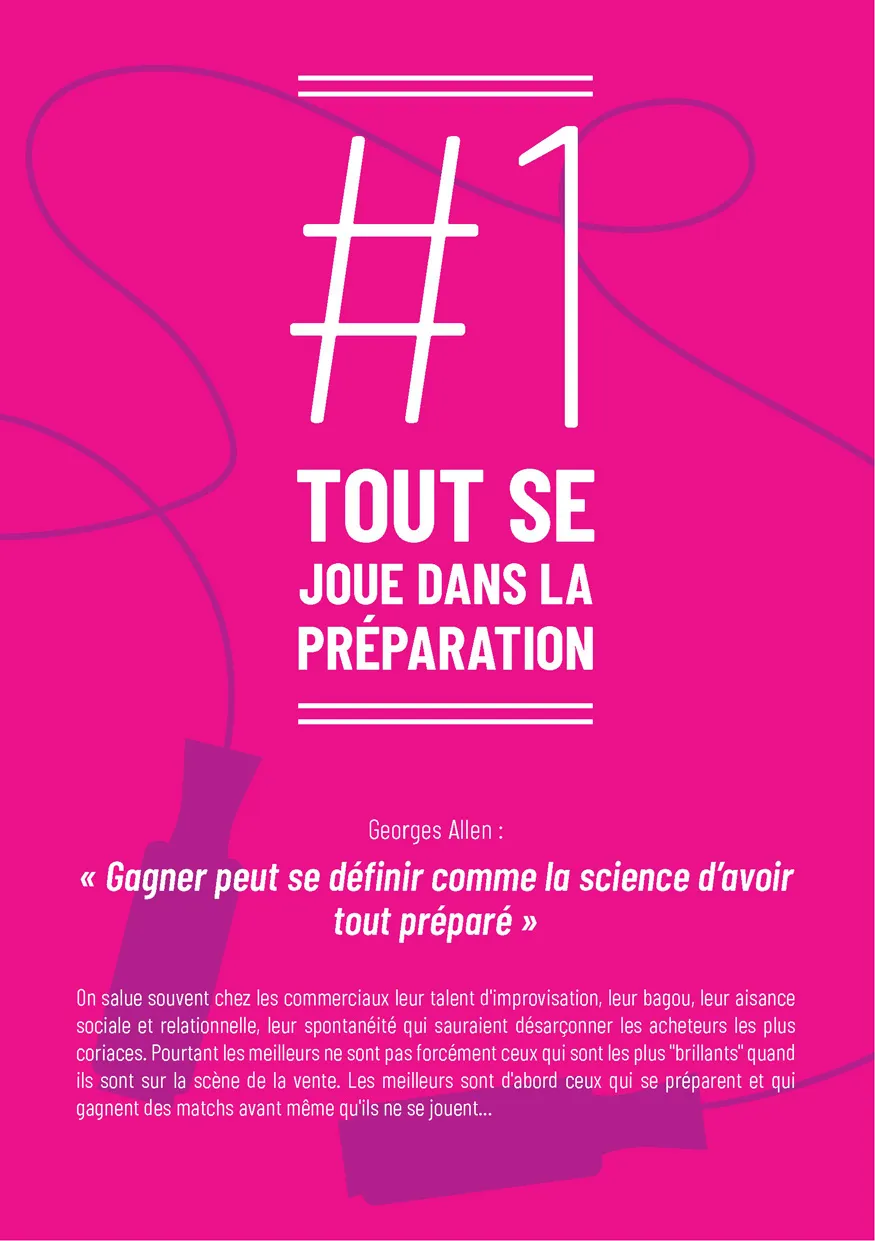 Une bonne préparation permet d’avoir un coup d’avance, de ne jamais être déstabilisé et de disposer des bons appuis avant même que les obstacles ne se présentent. Un bon vendeur n’est pas une tête brûlée. Il a horreur des risques et va tout faire pour les anticiper et mieux les contourner.