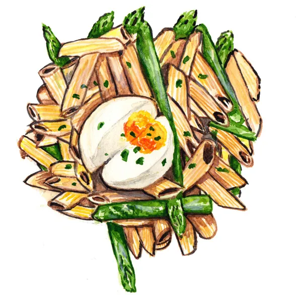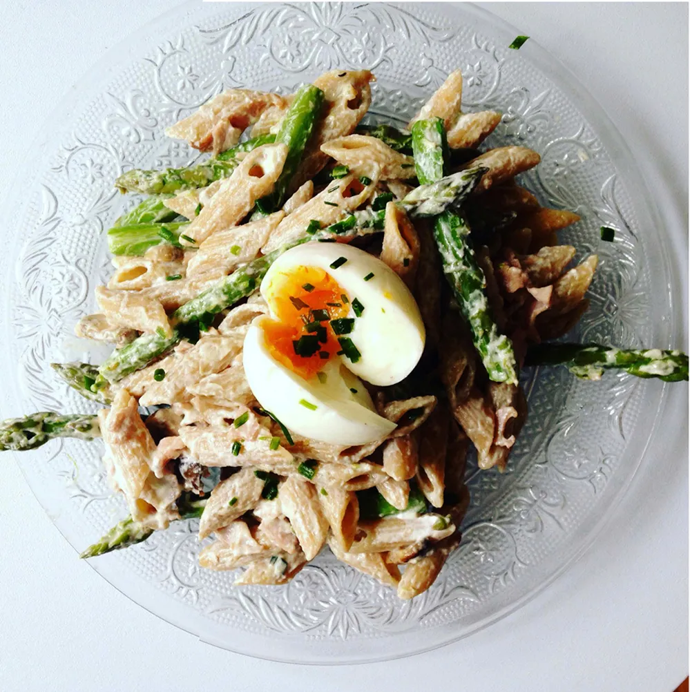 PENNE COMPLETS AU CHÈVRE, BACON, ET ASPERGES
