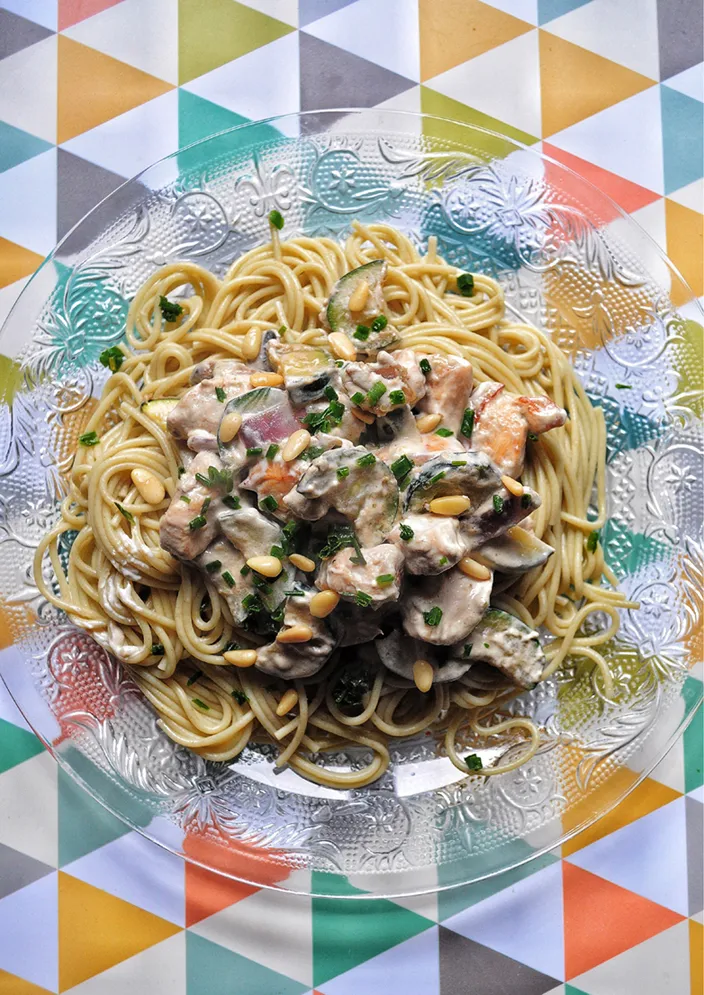 SPAGHETTIS DE QUINOA, COURGETTES, ET POULET AU LAIT DE COCO