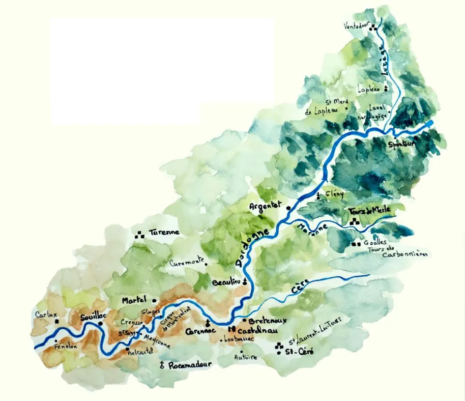 La Dordogne, voie commerciale attestée dès le 8ème siècle, suscite bien des convoitises, notamment celles d’une puissante vicomté du Limousin : Turenne. Cette dernière, créée au 11ème siècle, va englober tout le nord du Quercy pour s’assurer le contrôle de la rivière depuis Argentat jusqu’à Carlux. Par vassalité envers le duc d’Aquitaine, elle devient territoire anglais. Elle sera ensuite rattachée au royaume de France, puis reprise par les Anglais pour être finalement libérée par Du Guesclin. Elle n’échappe ni à la guerre de Cent ans ni aux pillages des « routiers », mais elle s’enrichit grâce à l’octroi d’importants privilèges royaux et devient une des vicomtés les plus riches et les plus puissantes du royaume, s’appuyant sur des points forts tels que les cités marchandes de Martel et Beaulieu, ainsi que l’impressionnante citadelle de Merle.