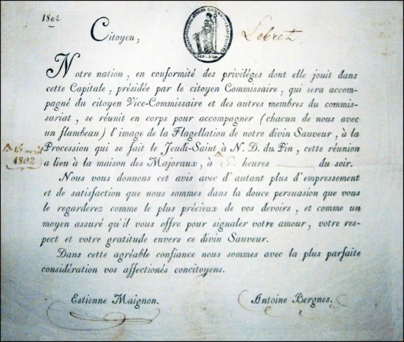 Convocation pour le défilé de la Flagellation, 1802. Archives Diplomatiques de Nantes.