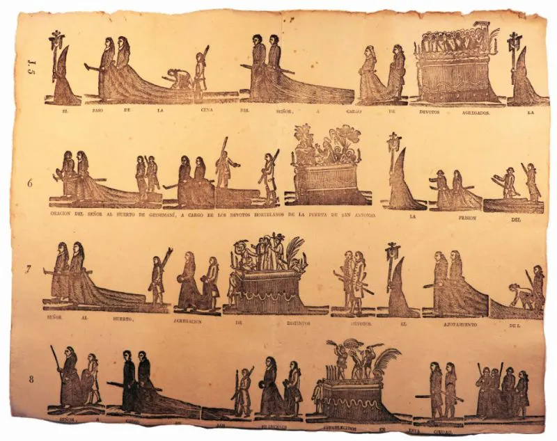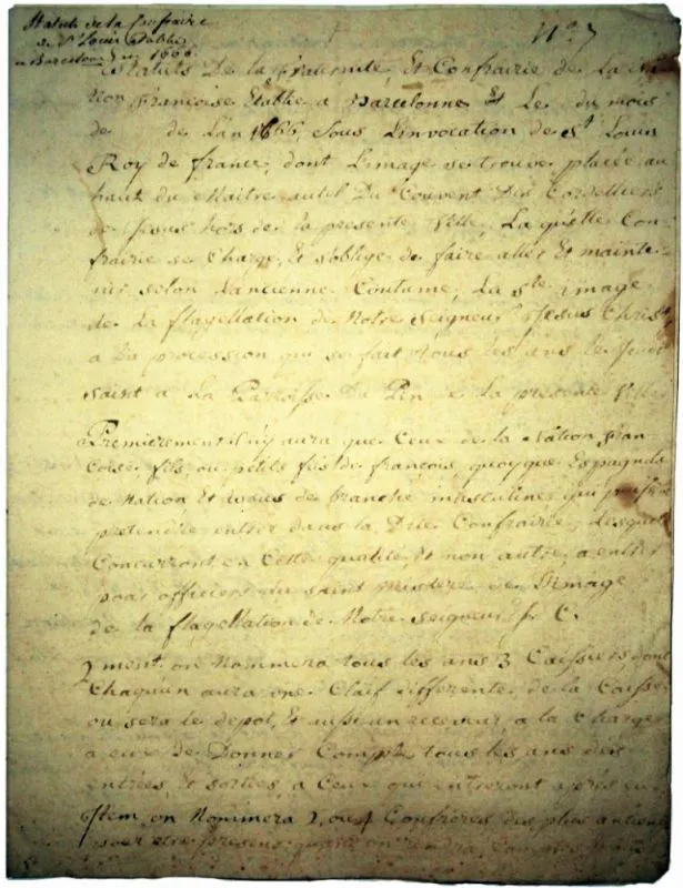 Extrait de la procession des Français de la ville, 1817. Archives de la Paroisse de Santa Maria del Pi. En tête, se trouve la Croix de guide. Elle est suivie d’individus portant de longues robes, celles-ci servent à masquer les prétendues chaînes qu’ils traînent. Eux-mêmes sont suivis d’un individu, noble, probablement le consul, accompagné d’un domestique qui porte la traînée de sa robe. Tous portent des torches. Jusqu’au XVIIe siècle, les flagellations étaient publiques. Au-delà, celles-ci passent dans la sphère privée et ne sont plus admises dans les processions.