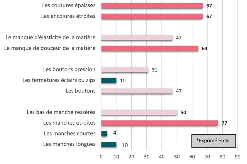 - Près de 8 personnes sur 10 sont particulièrement incommodées par l’étroitesse des emmanchures, et 5 le sont par les bas de manche resserrés ;