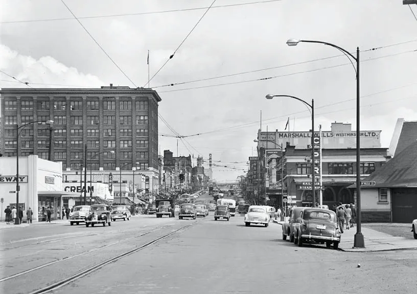 Vue de la rue Columbia dans les années 1950 en regardant vers l’est (8e Rue et rue McNeely). On aperçoit l’îlot Westminster, le magasin Safeway, l’immeuble de la British Columbia Electric Railway Company et la gare du Chemin de fer Canadien Pacifique.