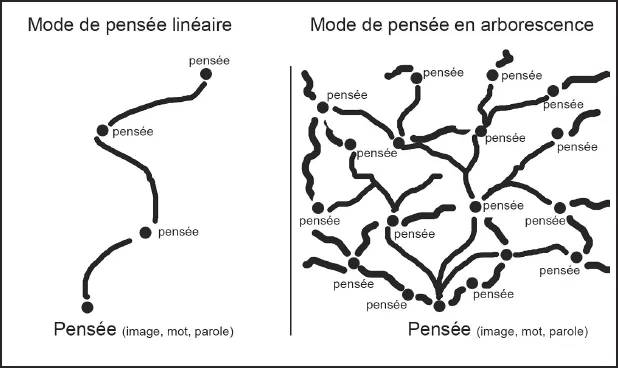 un mode de pensée dit en arborescence, différent de la majorité des personnes qui ont un mode de pensée plus linéaire (voir graphique ci-dessous) ; à noter que chaque pensée peut générer des émotions, les renforcer et les démultiplier.