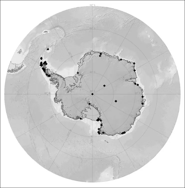 Typology, features, and distribution of the cultural heritage that this framework represents provide context for the broader discourse analysis within this chapter. A typology of HSMs was first offered by Patricia Warren in 1989 that delineated eight categories on which states base an HSM proposal : to commemorate the Heroic Era, an expedition, the deceased, a station, scientific work, a national hero, a head of state visit, or no identifiable reason.4 Warren’s thesis was the first academic attempt to “fill a gap in the existing system for designating and protecting the Historic Monuments of the Antarctic,”5 and her categories still stand today. With regard to the physical features of the HSM themselves, Ricardo Roura suggests that buildings, camps, and human remains are the “things” most commonly designated as HSMs in his geopolitical survey of the List in 2016.6 In this study he also found that the primary function of HSMs is site occupation, as this can effectively provide a state with a timestamp for their presence on the continent.7 Lastly, the geospatial distribution of HSMs across the continent is not uniform — as indicated in Figure 1.2 by the concentration of crosses that represent HSMs on the peninsula.