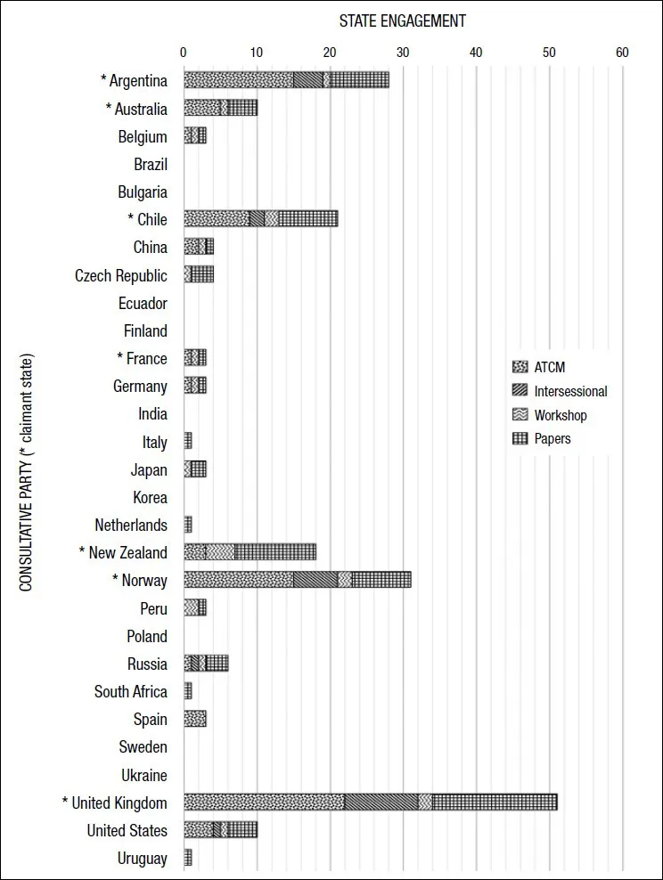 What one person considers or conceives of as heritage, another may not ; therefore, how does this incongruity play out in the Antarctic context, or more pertinently, who are the authors of discourse on Antarctic heritage ? Fifty-four states, who account for a majority of the world’s population, have acceded to the Treaty.8 But given the power dynamics present within the ATS — detailed further below — a hierarchy of heritage was suspected. In order to discern whose perspective was, and is, being privileged over others, a discourse analysis was undertaken. This analysis included the coding of official papers, statements, and reports within the regime that governs Antarctic heritage (the ATS) ; and identifying the parties who wrote them, submitted them, or supported their claims. Although the limitations of this quantitative reading are appreciated, such an interpretation does produce a valuable overview of which states’ perspectives are being formally recorded and translated into international law more often than others. This enshrinement within international law is what makes this perspective count. The legislation of this perspective is particularly important given that continued peace within the region relies on the states’ steadfast commitment to the multilateral institutions that govern it. Of the 54 Antarctic states : 29 are consultative parties authorized to partake in decision making ; 12 of these are original signatories, who have been present since the Treaty was signed in 1959 ; and 7 are claimant states9 — that is, states that made a formal claim to a territory in Antarctica prior to the Antarctic Treaty’s freezing of these claims. The Treaty neither supports nor denies these claims, but stipulates that they must not be acted upon while it is in force.10 Therefore, due to their high level of investment in the region’s geopolitics, it was expected that the claimant states would be much more active in the development of the Antarctic heritage framework than the non-claimant states, as confirmed in Figure 1.3.