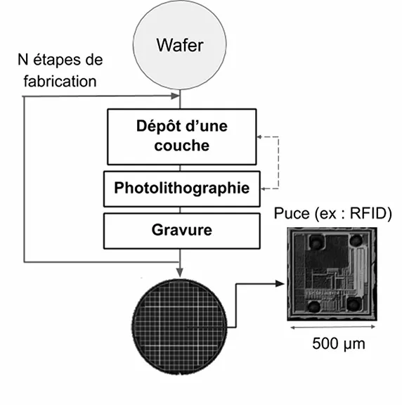 Une fois la production des wafers effectuée, ceux-ci vont être achetés par différents fabricants de puces électroniques. Au préalable, la conception de la puce a été réalisée et celle-ci a été modélisée couche par couche à l’aide d’un logiciel de conception spécifique. Sur l'intégralité de la surface du wafer seront répliquées un maximum de puces. Ensuite à l'échelle du wafer on extrait numériquement toutes les couches qui composent le composant. À chaque couche correspond une ou plusieurs étapes de fabrication (un schéma simplifié illustre le procédé général de fabrication d’une puce RFID, ci-après). Par exemple, les pistes conductrices d’un bus de communication de la puce peuvent constituer une ou plusieurs épaisseurs. Ces pistes peuvent relier par exemple le calculateur ou le processeur aux blocs mémoires et périphériques, tel le modem de télécommunication. Prenons une de ces couches métalliques comme exemple pour décrire quelques étapes clés de la nanofabrication sur silicium.