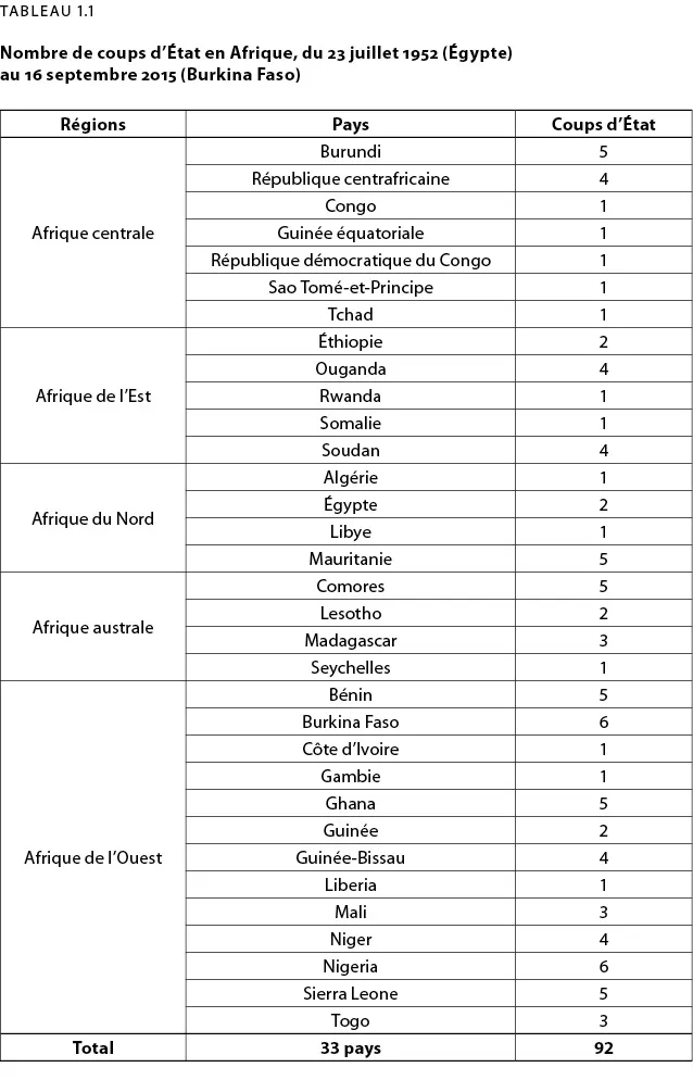 L’Afrique de l’Ouest est la région d’Afrique où l’on a recensé le plus grand nombre de putschs. Entre 1960 et septembre 2015, on y commet 46 coups d’État militaires, soit la moitié de tous ceux réussis sur l’ensemble du continent africain. Dans cette région, seuls le Sénégal et Cap-Vert ont été épargnés, du moins jusqu’ici. Les coups d’État, devenus rares dans la plupart des régions du monde, sont encore un phénomène récurrent en Afrique. Ils peuvent être menés aussi bien en période de stabilité (précaire) qu’en contexte de guerre, autant dans des systèmes autoritaires que dans des pays dits démocratiques (le Mali, par exemple). Ils sont sans nul doute liés à la nature autoritaire des régimes politiques, l’orientation des forces armées ou les deux à la fois.