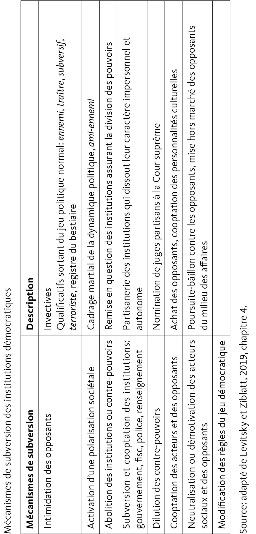 Or, comme l’ont souligné plusieurs sociologues, la démocratie est un régime politique pouvant constamment être amélioré et qui n’est jamais à l’abri de vagues de dé-démocratisation. Ce qui nous intéresse ici, ce n’est pas de situer le populisme de droite par rapport à la démocratie en général, mais pas rapport à la démocratie libérale et à l’État de droit tels qu’ils se sont institutionnalisés dans la seconde moitié du 20e siècle. Les mécanismes de consolidation autoritaire recensés par Levitsky et Ziblatt dans leur ouvrage La mort des démocraties paraissent pertinents pour ce faire.