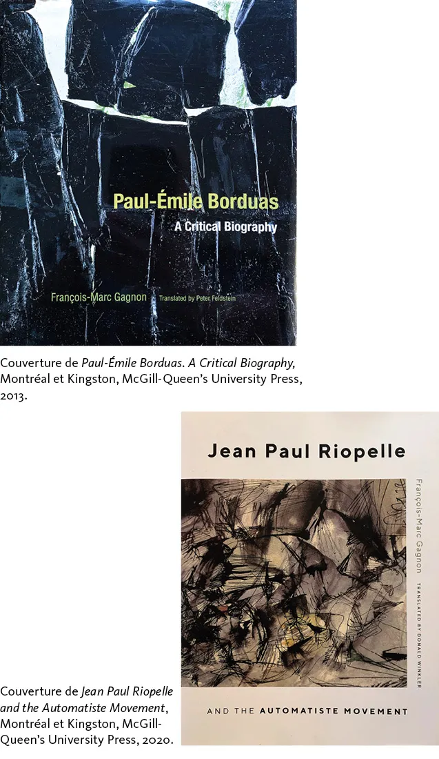 Cadrons d’abord l’œuvre. Selon son curriculum vitæ, François-Marc publie son premier article sur Borduas et l’automatisme dans La Barre du jour en 1969 et son premier article sur Refus global en 1973, dans le collectif Ozias Leduc et Paul-Émile Borduas. Deux ans plus tard, Charles C. Hill publie Peinture canadienne des années trente. En 1978, François-Marc publie son opus magnum, la biographie de Borduas. Pour m’inclure dans le cadre, avec Esther Trépanier, le collectif que nous avons publié à la suite d’un colloque, L’avènement de la modernité culturelle au Québec, paraît en 1986. Deux ans plus tard, François-Marc publie le catalogue de l’exposition rétrospective sur Borduas dont il fut le conservateur invité. La Chronique du mouvement automatiste québécois, 1941-1954 est publiée dix ans plus tard, en 1998, année où paraît aussi la synthèse d’Esther Trépanier, Peinture et modernité au Québec, 1919-1939. Entre-temps, André-G. Bourassa, Jean Fisette et Gilles Lapointe ont entrepris l’édition critique des Écrits de Borduas, dont le tome I paraît en 1987 et le tome II, volumes 1 et 2 (Journal, Correspondance, 1923-1953 et Correspondance, 1954-1960), en 1997. Telle est la constellation éditoriale globale de l’œuvre et de satellites.