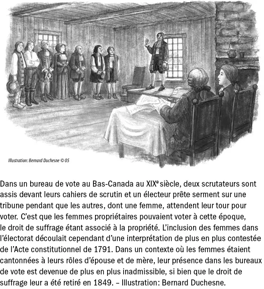 La possibilité de se marier en séparation de biens en signant un contrat de mariage devant notaire avant la noce, une disposition qui n’existe pas dans le droit anglais, permet aussi à un certain nombre de femmes mariées d’être propriétaires en titre, et donc de voter, tout comme le statut de marchande publique, qui autorise celles qui en bénéficient à gérer leurs affaires commerciales de manière indépendante. Si des historiennes notent la présence, ici et là, de quelques électrices dans les bureaux de scrutin des autres colonies de l’Amérique du Nord britannique à la même époque, on ne s’étonnera donc pas de constater que le vote des femmes atteint, dans le Bas-Canada, une ampleur inégalée. Il faut néanmoins spécifier que ce droit au suffrage leur est conféré de manière tout à fait involontaire et que son exercice s’avère donc souvent difficile et plutôt aléatoire, surtout que les procédures électorales favorisent les pratiques discrétionnaires.