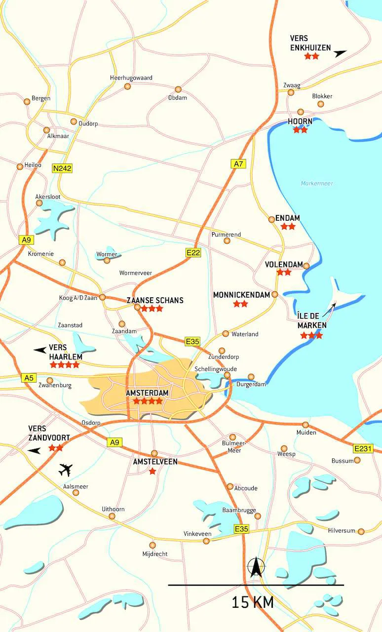 Si Amsterdam est une destination que plusieurs séjours ne suffiront pas à vous faire découvrir, elle peut aussi constituer une invitation à découvrir ses environs directs. Elles donnent accès à un monde pittoresque et bucolique et peuvent se faire sur la journée. Que diriez-vous d’une virée vers le Nord pour découvrir la vraie Hollande et les ports de pêche de l’Ijsselmeer ou Edam, Enkhuizen et Hoorn ? Direction le Sud, les champs de fleurs, Lisse, Haarlem la magnifique et son musée Frans Hals ou alors Zandvoort pour le plein d’iode ? La Haye, capitale politique et royale du pays, offre une atmosphère quelque peu surannée avec le magnifique Mauritshuis, le musée Voorlinden et la plage de Scheveningen. Delft est la ville historique de Vermeer, d’une incroyable beauté, un voyage dans le temps