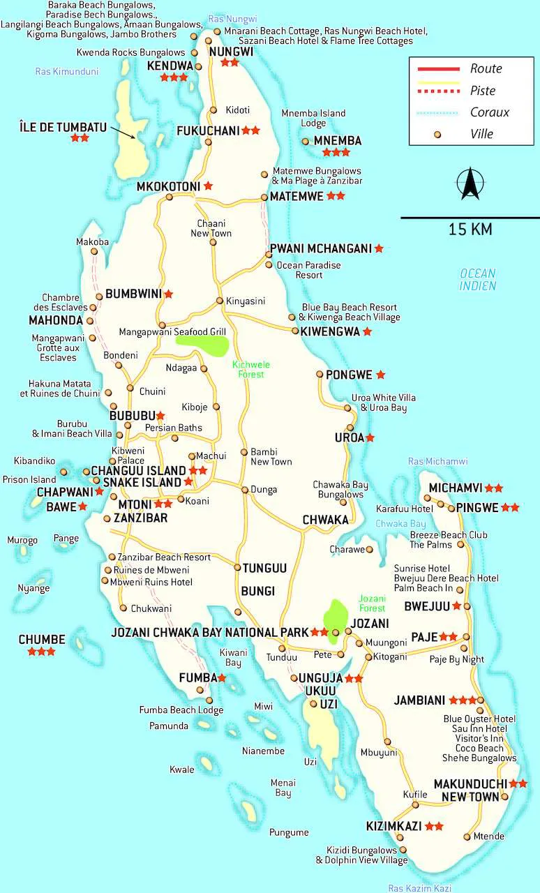 La principale île de l'archipel de Zanzibar se nomme Unguja, mais en réalité c'est la plus touristique : la quasi totalité des hôtels s'y trouvent et on l'appelle « Zanzibar » également. Si Stone Town est incontournable pour son histoire, son ambiance et son architecture, chaque partie de l’île a son charme. Au nord-ouest, Nungwi et Kendwa disposent de belles plages dans la mer turquoise, d'une vie locale animée. Au nord-est, de Matemwe (face à l'île de Mnemba) à Kiwengwa, la plage est calme, plus sauvage et bordée de nature, les resorts plus exclusifs. Le sud-est, de Michamvi à Makunduchi, compte de merveilleuses plages de sable blanc face au lagon corallien. Paradis des kitesurfeurs, principalement Pajé et Jambiani, l'ambiance est festive, plus jeune, les prix moins élevés qu'au nord de l'île. Le sud-ouest est peu construit. Au centre enfin, le seul parc national de l'île : la forêt de Jozani et ses singes colobes.